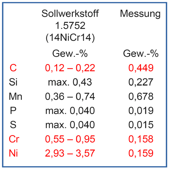 Die Zusammensetzung einer Stahl-Flachprobe war unklar. Vermutet wurde, dass es sich um den Einsatzstahl 14NiCr14 (kurz: "Sollwerkstoff") handelt.