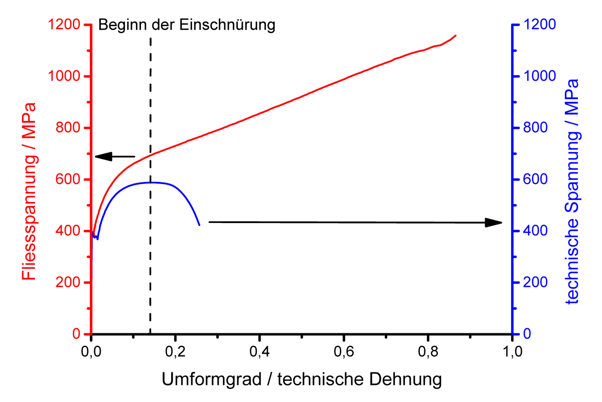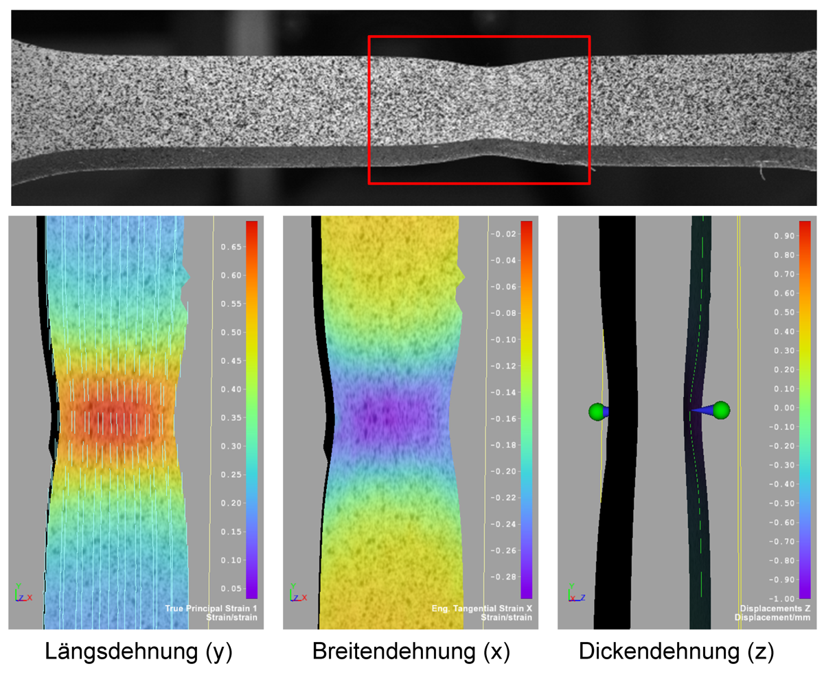 Die Probendehnungen werden in Echtzeit während des Versuchs in Längs-, Dicken- und Breitenrichtung ermittelt. Die wahren Spannungen ergeben sich aus der anliegenden Kraft und dem wahren Probenquerschnitt zu jedem Zeitpunkt.