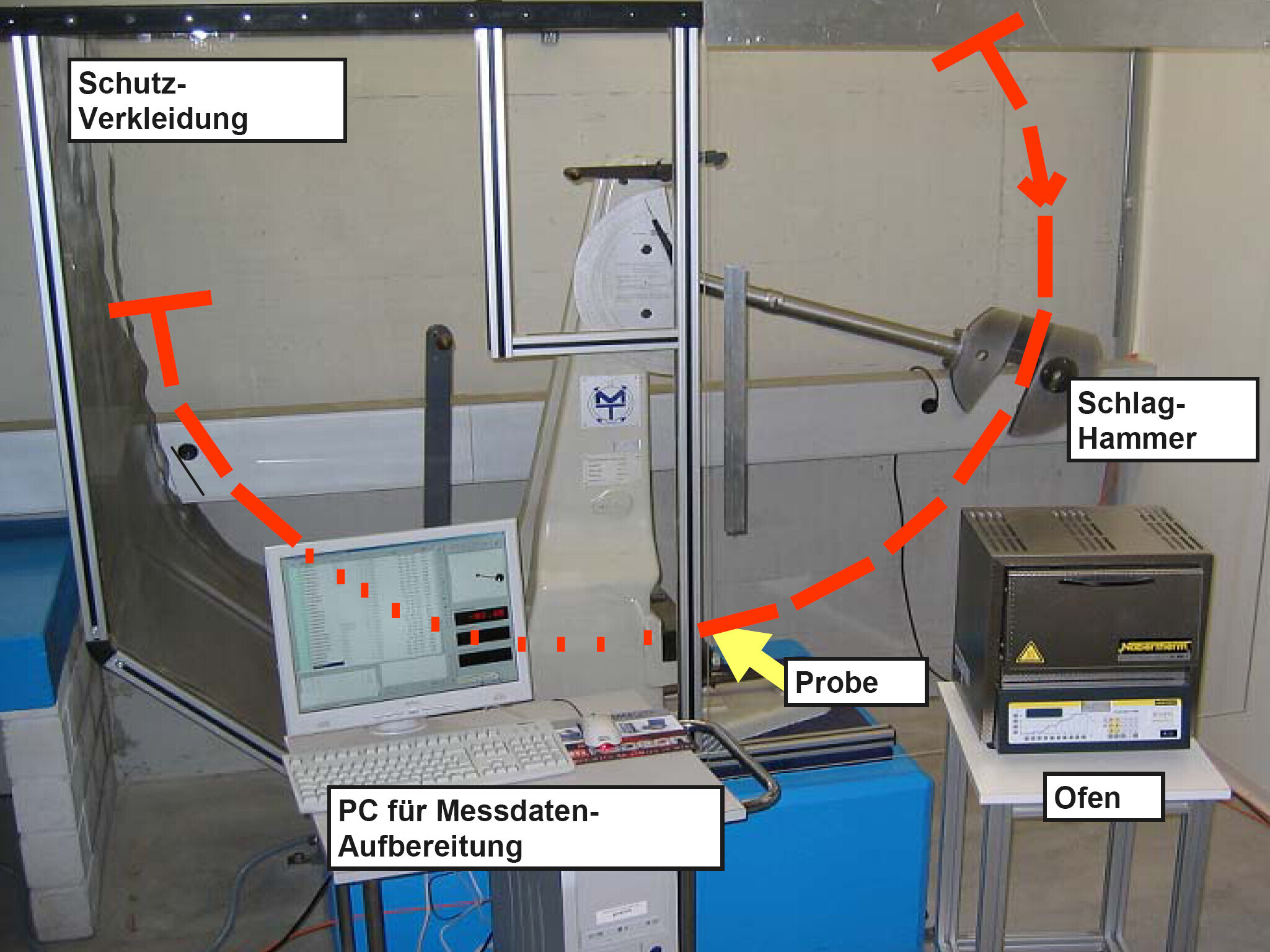 Die Auslesung erfolgt mit einem Winkelencoder über einen PC. Ein Kühlschrank bis -30°C und ein kleiner Ofen bis 1000°C dienen zum Temperieren der Proben vor dem Schlagen.