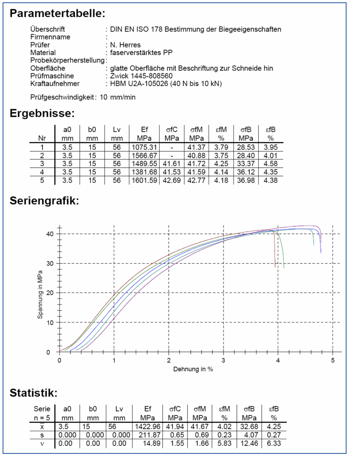 Geprüft wurden die Biegeeigenschaften von faserverstärktem Polypropylen im 3-Punkt-Biegedruckversuch (DIN EN ISO 178)