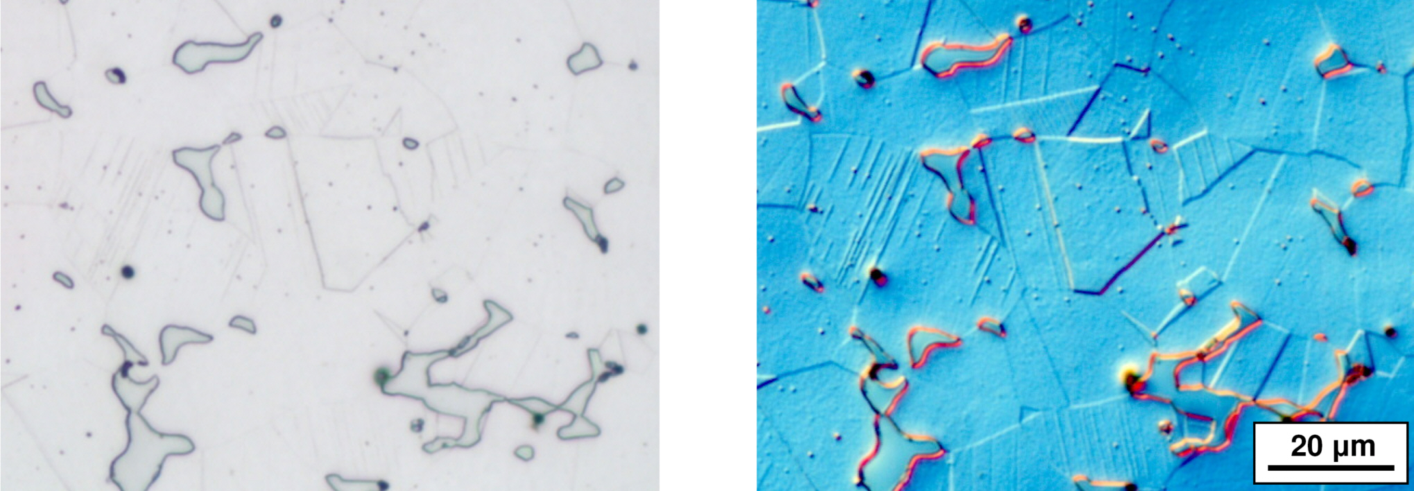 Die Abbildung im Differential-Interferenz-Kontrast (rechts) zeigt die Umrisse der Körner deutlicher. Dies deshalb, weil die Ätzgeschwindigkeit je nach Korn-Orientierung bei der elektrolytischen Präparation unterschiedlich war und so geringe Höhenunterschiede entstanden, für die der DIC sehr empfindlich ist. Die zueinander parallelen Linien im Inneren der Austenitkörner sind wenige Nanometer hohe Oberflächenstufen. Sie entstanden unter mechanischer Belastung durch Scherung von Gitterebenen parallel zu den {111} Ebenen des jeweiligen Korns.