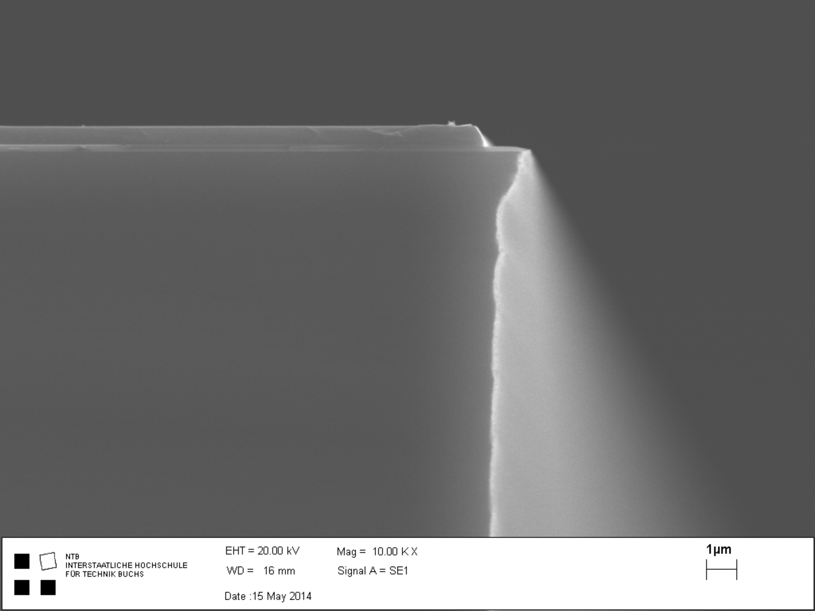 Silizium-Ätzprozess mit kleiner Ätzrate dafür nahezu 90° Flankenwinkel. Geeignet für Ätzungen mit Tiefen bis zu 100 µm, wo senkrechte Seitenwände gefordert sind. Ebenfalls geeignet für SOI-Prozesse.
