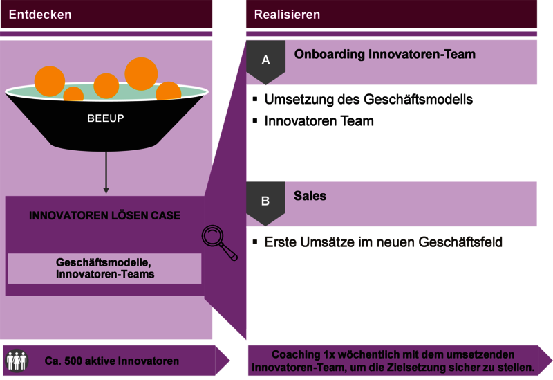 Der Prozess beginnt mit einem sogenannten Case: einer realen Unternehmenssituation, ähnlich wie eine MBA-Fallstudie – aber ohne vorgegebene Lösung. Der Case beschreibt die Geschichte, Stärken und aktuellen Herausforderungen einer Unternehmung. Als Beispiel haben wir die Plattform BeeUp – ein Spin-Off unseres Instituts – genutzt.