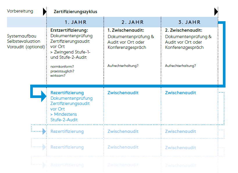Die folgende Abbildung zeigt den 3-Jahres-Zyklus der Zertifizierung und der Aufrechterhaltung in den verschiedenen Phasen.