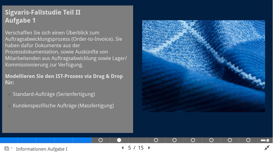 Damit sich Studierende im Unterricht realitätsnah mit der Analyse von Geschäftsprozessen auseinandersetzen können, wurde von IPM-Dozent Wolfgang Groher in enger Zusammenarbeit mit dem Unternehmen Sigvaris in St. Gallen eine digitale Fallstudie für die Kundenauftragsabwicklung (Order-to-Invoice Prozess) entwickelt. Relevante Informationen zum Prozess werden dabei für die Studierenden digital verfügbar gemacht. Dazu zählen Prozessdokumentationen, Videodaten zum Prozessablauf, Interviews mit Mitarbeitenden, sowie Daten aus dem ERP-System.