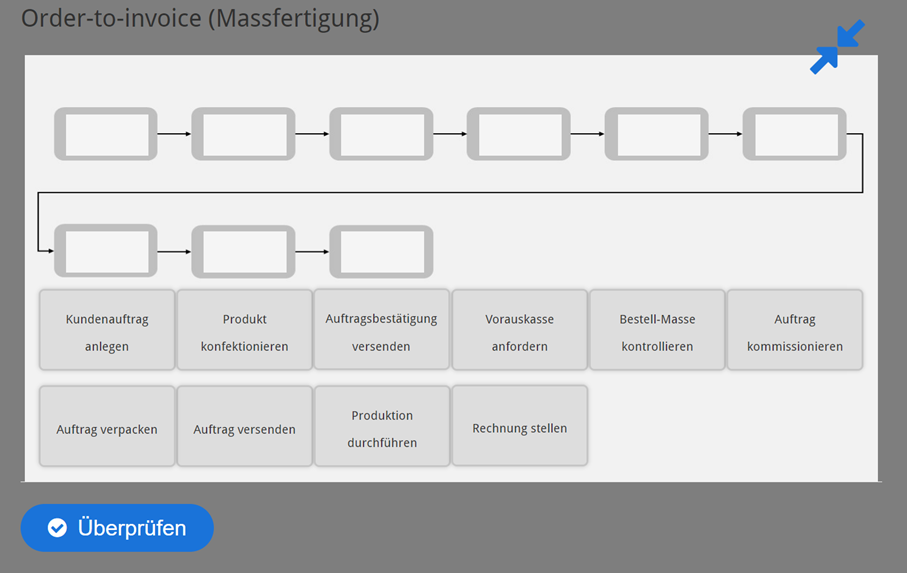 Die Aufgabe für die Studierenden besteht darin, sich mittels eines interaktiven Quiz mit dem Prozess vertraut zu machen und Schwachstellen zu identifizieren. Dabei steuern sie selbst, auf welche Informationen sie wann zugreifen und geben am Ende eine erste Einschätzung zum Verbesserungspotenzial ab.
