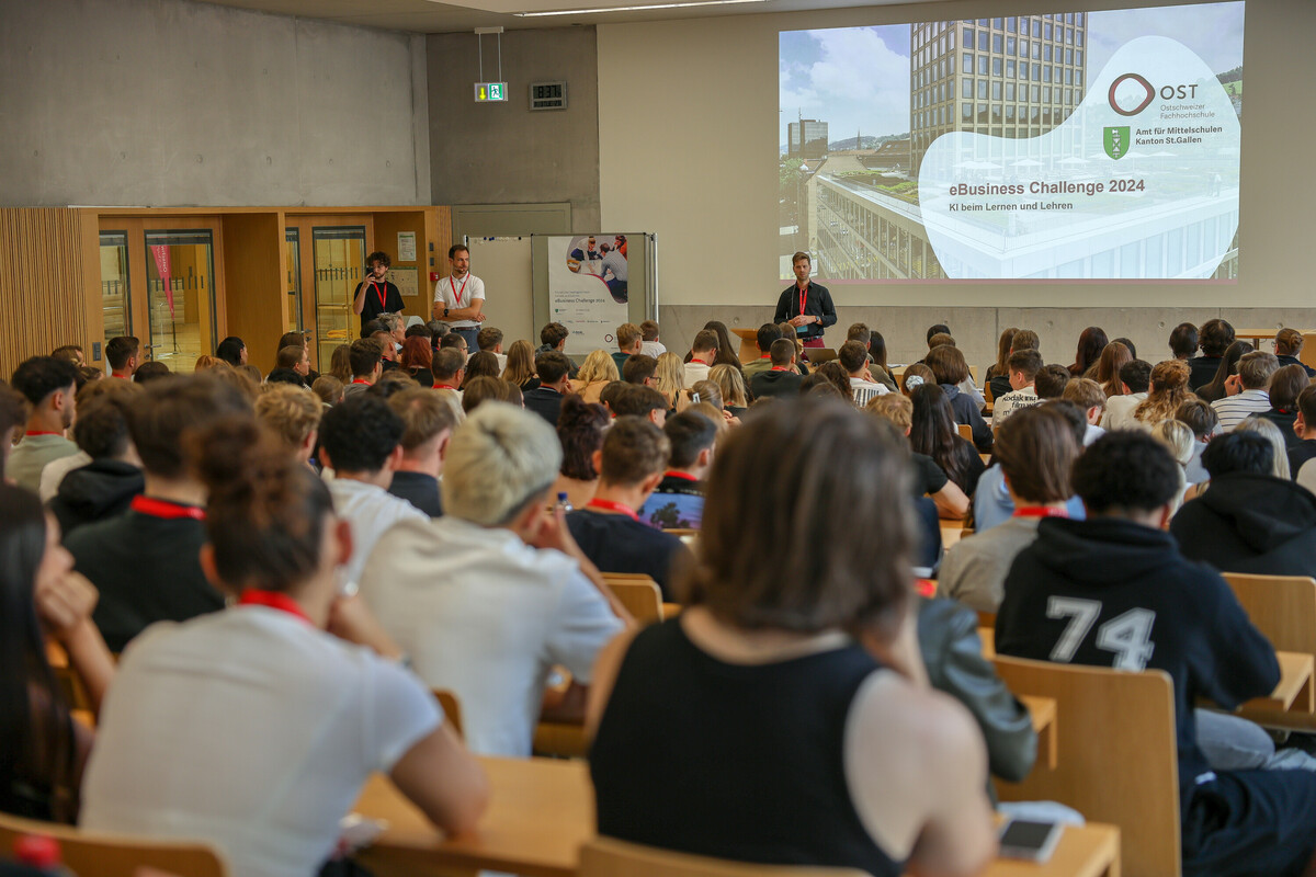 An der «eBusiness Challenge 2024», eine Veranstaltung des Instituts für Informations- und Prozessmanagement der OST – Ostschweizer Fachhochschule, suchten rund 180 junge Erwachsene nach Lösungen zum Thema Künstliche Intelligenz beim Lernen und Lehren . Themensponsor der diesjährigen Durchführung: das Amt für Mittelschulen des Kantons St.Gallen.