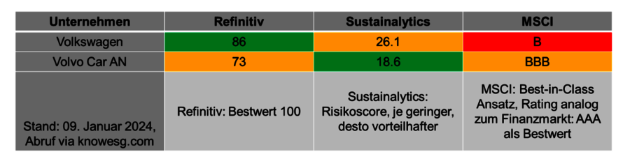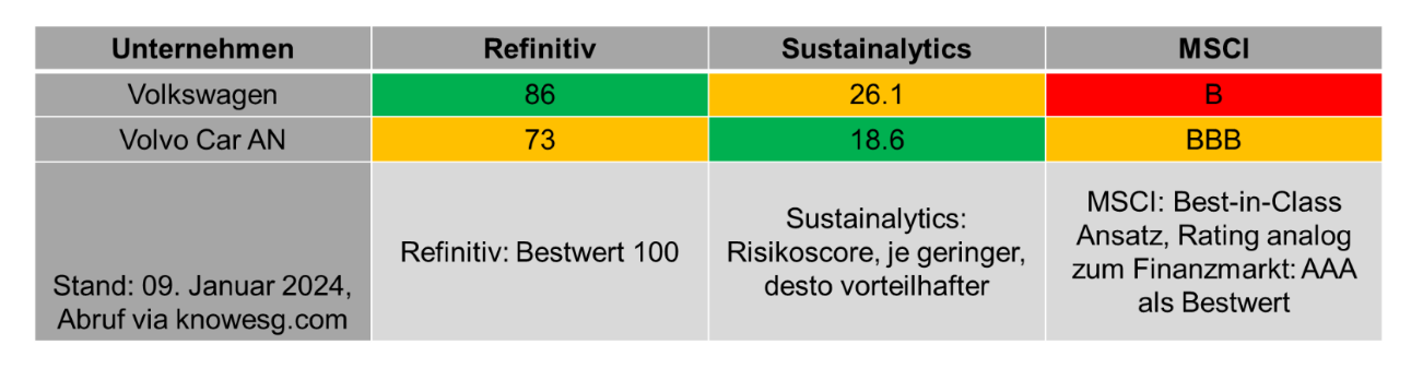 Das Verfahren erinnert an das klassische Kapitalmarktrating, auch weil einige der Ratenden und Ratings (z.B. AAA-BBB) dieselben sind. Zentral ist, dass die Methode und Aussage zwischen den Ratingagenturen stark divergieren (vgl. Tabelle unten), so folgt den Marktführer MSCI einen Best-in-Class Ansatz, während andere Branchenrisiken integrieren. Hierdurch lassen sich auch unterschiedliche Bewertungen desselben Unternehmens je nach Ratingagentur erklären (Berg et al. 2022)
