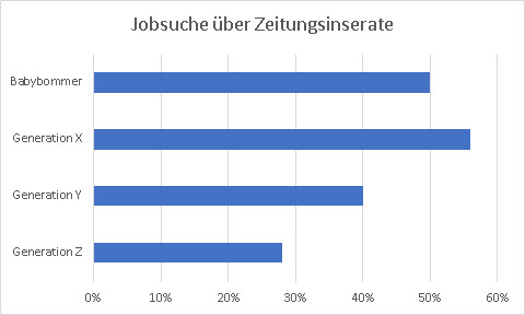 Abbildung 1: Die Generation Z sucht kaum mehr nach Stellen über Zeitungsinserate. Bei den vorangehenden sind es immerhin noch 40% und mehr (Quelle: Studie von Zeam und Link*)