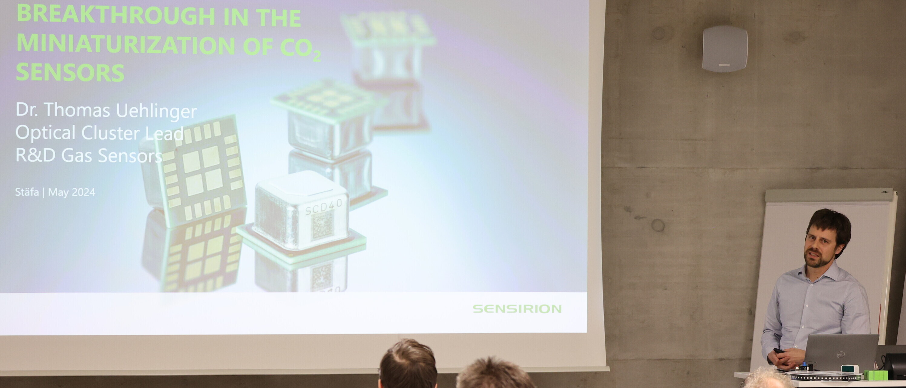 Dr. Uehlinger präsentierte eindrucksvoll die Evolution des weltweit kleinsten spektroskopischen CO2-Sensors von Sensirion. Der Vortrag zeigte die Evolution vom grösseren Vorgängersystem über die ersten Prototypen bis hin zum fertigen Endprodukt, welches nun in Millionenstückzahlen produziert wird.