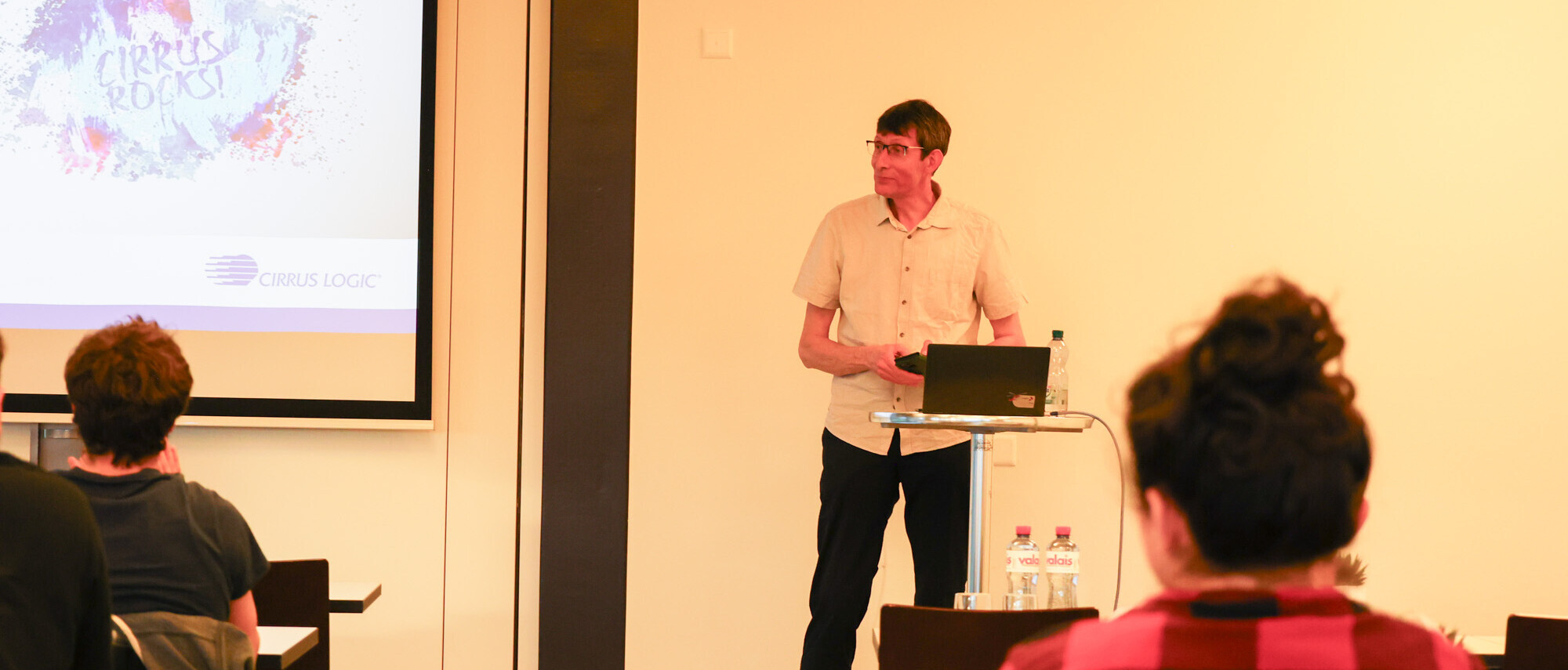 Dr. Erich Zwyssig von der Firma Cirrus Logic vom Standort Edinburgh kam nach Rapperswil, um aus erster Hand von den Herausforderungen über die Chipentwicklung im grossen Stil zu berichten. Die Firma Cirrus Logic stellt Chips für den Audiobereich her, welche in Computern, Soundstudios, Handys, Autos und Hörgeräten weltweit eingesetzt werden. Mit Stückzahlen von 6 Millionen Chips pro Monat braucht es eine solide Testumgebung, damit den Ansprüchen gerecht produziert werden kann.