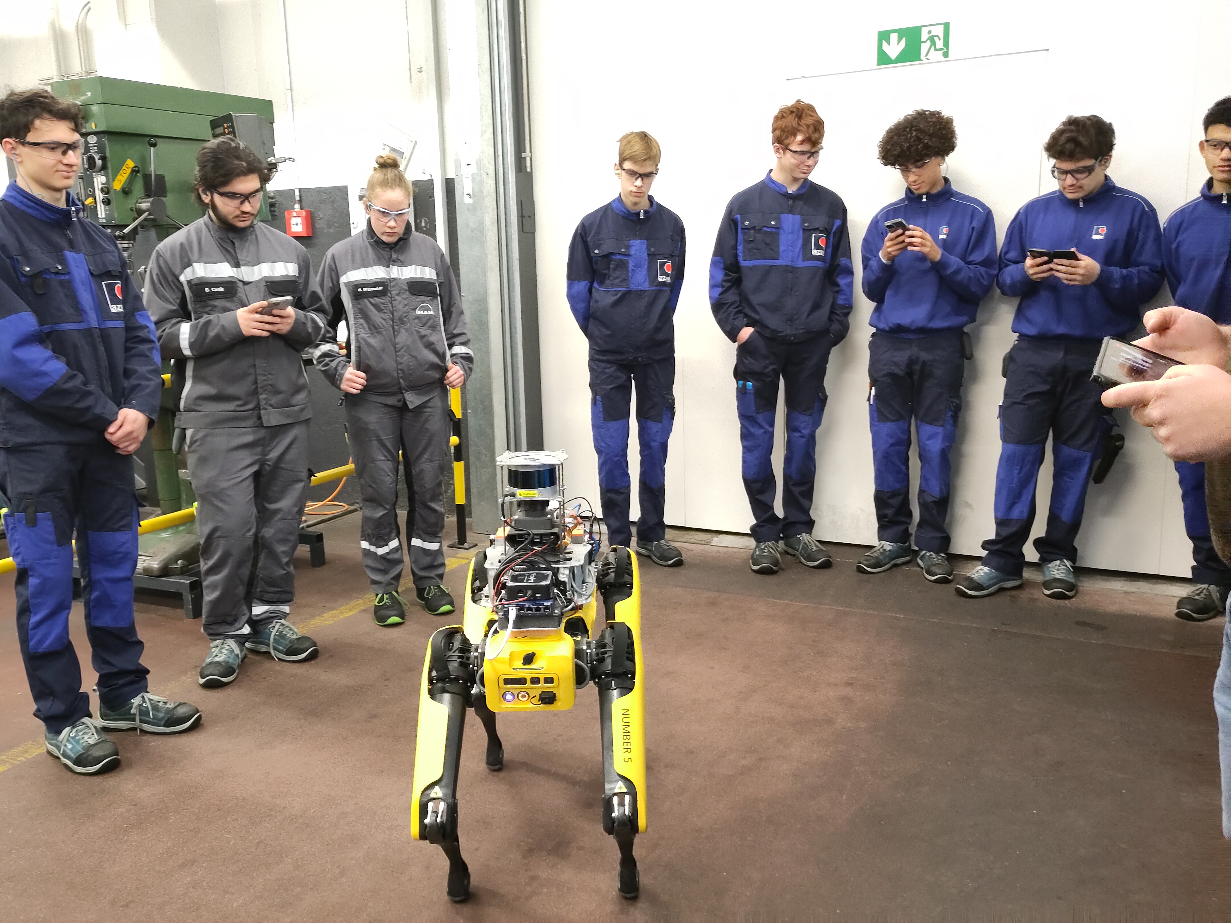 Bei einer PR Aktion des Studiengangs Maschinentechnik Innovation M|I ist das SPOT-Team des ILT in Winterthur gewesen. Die Nr. 5 überquerte fast selbständig die Strasse und begeisterte die Schüler der BBW (Berufsbildungsschule Winterthur) und des AZW (Ausbildungszentrum Winterthur) in Ihrer Pause so sehr, dass ein Erkunden des Innenlebens der Werkstatt ein Muss wurde. Für viele Schüler war das die erste Begegnung mit einem gehenden Roboter und sie zeigten eine starke Neugier zum Thema Robotik und Automation. Die durch Studiengang M|I zur Verfügung gestellten Flyer und Gummibärchen waren schnell vergriffen ;-). Wir freuen uns auf die zukünftigen Studierenden, die auch neben dem klassischen Maschinenbau ein grosses Interesse für Robotik und Automation haben.