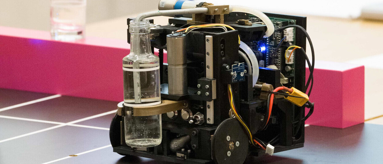 Damit die diesjährige Aufgabe erfüllt werden konnte, wurden die Roboter mit bis zu 19 Schaltern und Sensoren und mehreren Motoren ausgestattet. Jedes Team hat eine eigene Methode entwickelt, um das Wasser aus der Flasche ins Glas zu bringen. Zum Beispiel wurde eine sehr präzise Dosierspritze aus dem 3D-Drucker eingebaut. Andere Teams entwickelten ein höhenverstellbares Pumpsystem, wieder andere setzten Metallröhrchen oder Trichter ein und kippten die Flasche. Dabei galt es Grössenbestimmungen einzuhalten und die Roboter durften höchstens 3kg schwer sein. Um die Aufgabe präzise und effizient lösen zu können, mussten die einzelnen Teilfunktionen der Roboter gut zusammenarbeiten.