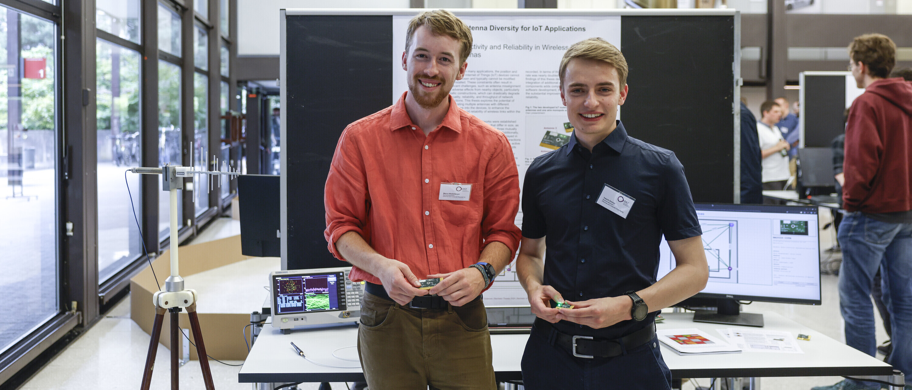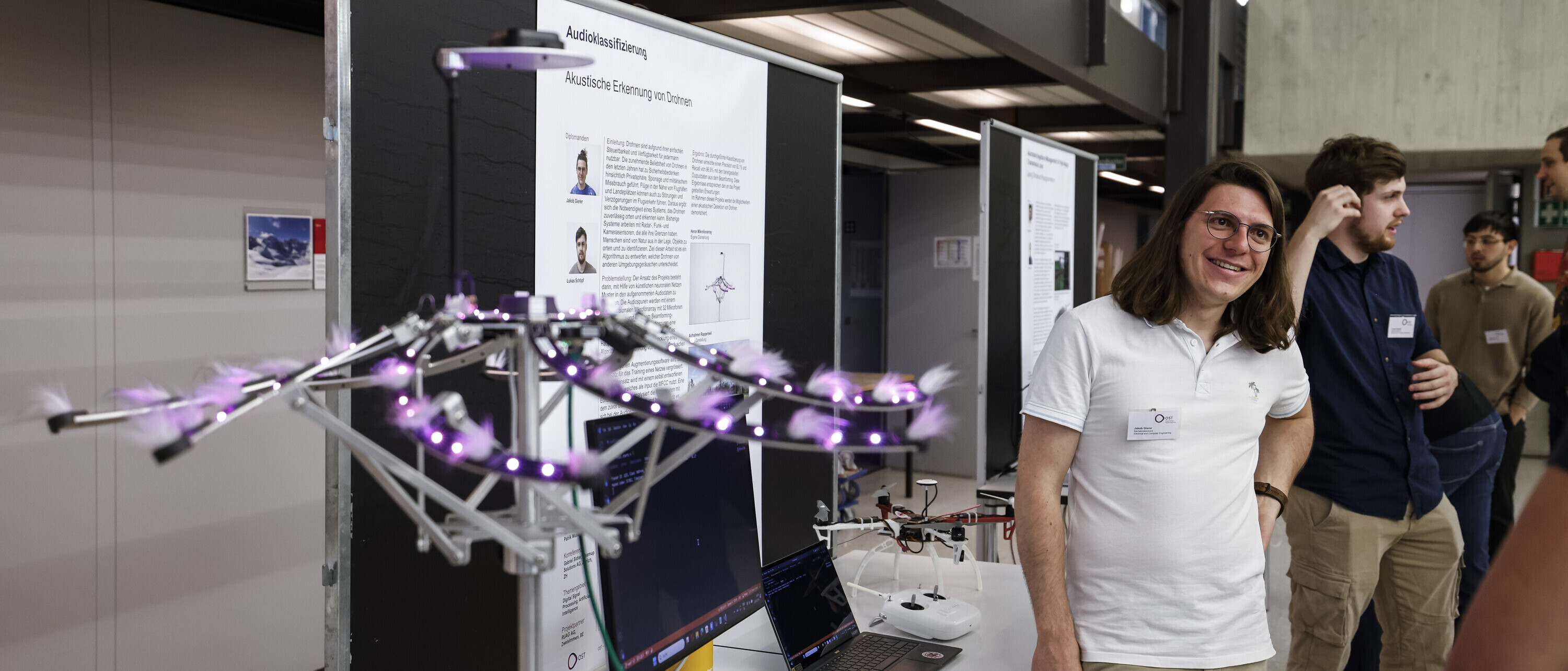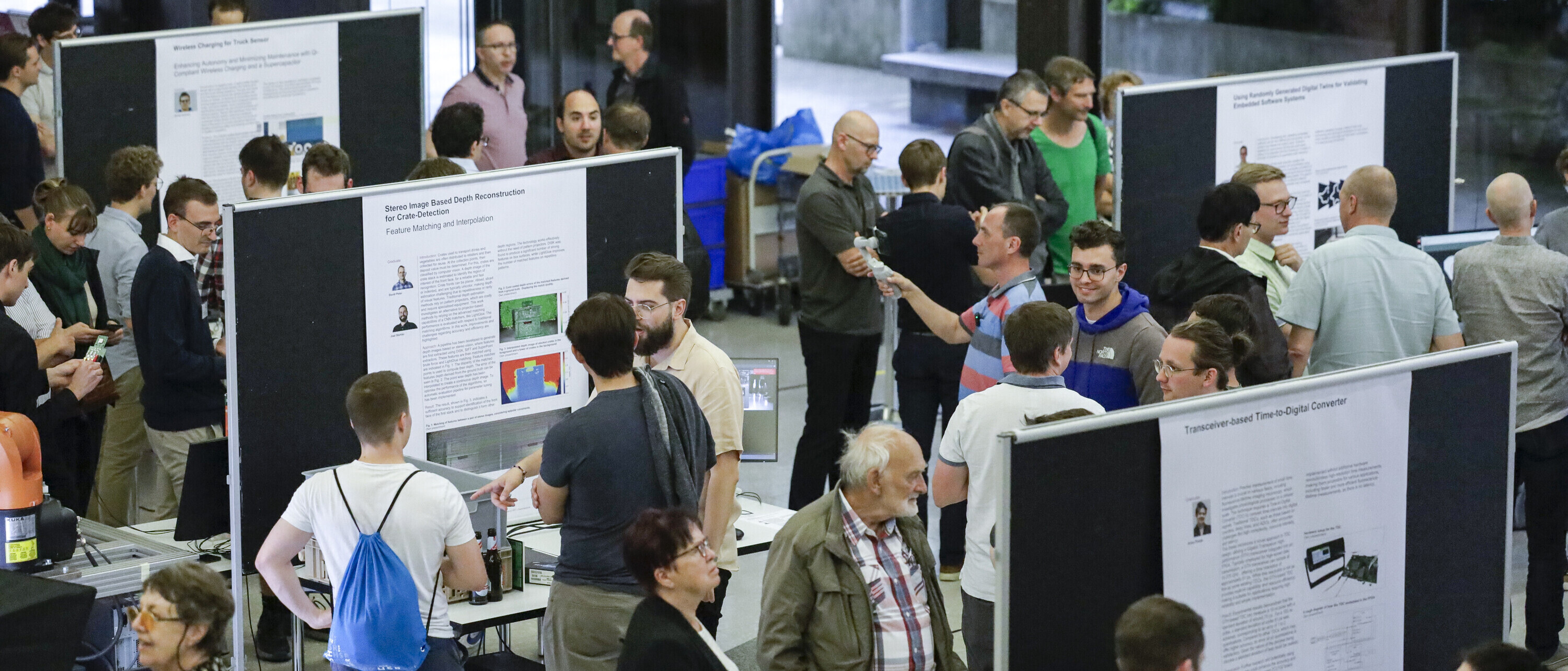 Die Aussstellung der Bachelorarbeiten im Studiengang Electrical and Computer Engineering zeigte eindrücklich die thematische Breite des Studiums und die Vielfalt der Anwendungsbereiche. Mit Exponaten, Postern und in persönlichen Gesprächen brachten die Studierenden ihre Arbeiten mit viel Engagement und Motivation den Besucherinnen und Besuchern näher. So konnten die Gäste, darunter Vertreter aus der Industrie, Familienangehörige und Freunde, für mehrere Stunden in die Welt von Künstlicher Intelligenz, Image Processing and Computer Vision, Mikroelektronik, Wireless Communications, Embedded Systems, Regelungstechnik und Embedded Software Engineering eintauchen.