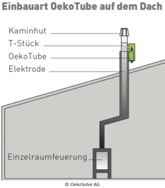 Für Grossanlagen sind heute schon gesetzliche Bestimmungen auf nationaler Ebene mit Grenzwerten bezüglich dem Feinstaubausstoss in Kraft. Für kleinere Anlagen sind solche Vorschriften in Vorbereitung. Für das Rauchgasfilter wird eine Elektrode zentriert in das Kamin platziert und an eine Hochspannungsquelle angeschlossen. Dadurch wird ein elektrisches Feld generiert, mit dem die Fein-staubpartikel geladen, sich an die Innenwand des Kamins bewegen und sich dort absetzen. Die Reinigung erfolgt durch den Kaminkehrer. Der Feinstaub wird somit aus der Luft gefiltert. Für kleine Anlagen besitzt OekoSolve schon eine eigene Hochspannungsquelle, für grössere Anlagen muss auf ein Zukaufprodukt gesetzt werden. Anfordernde Garantieabwicklungen und ein-geschränkte Verfügbarkeit zwingen das Unternehmen zu grossen Lagerbeständen.