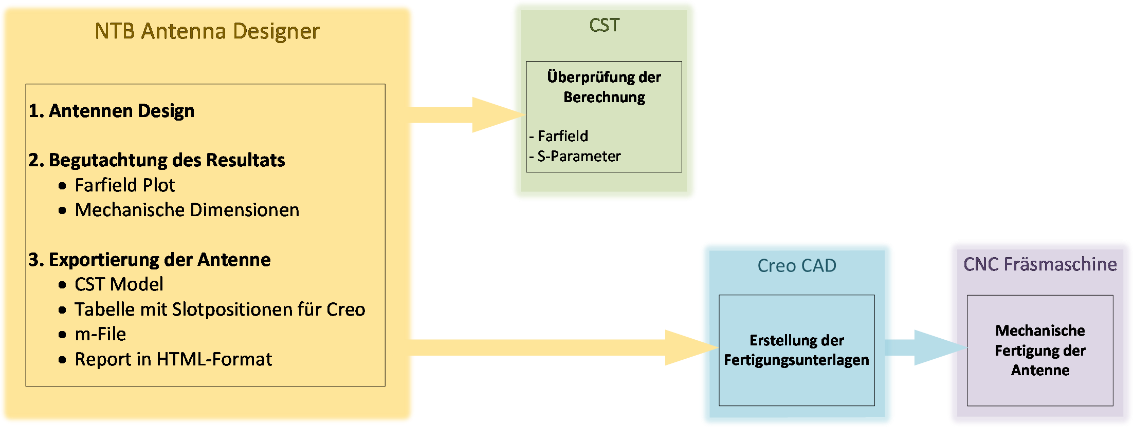 Der NTB Antenna Designer© ist ein vollwertiges Tool zum Berechnen und Exportieren von resonanten Waveguide-Slot-Antennen. Das Tool wurde in MATLAB entwickelt und kann über ein GUI bedient werden. Das Tool berechnet die Positionen und Dimensionen der Schlitze, die in den Rechteckhohlleiter gefräst werden müssen. Zur Veranschaulichung wird die theoretische Abstrahlcharakteristik und eine Skizze der Antenne generiert. Aus den Resultaten kann ein Modell generiert werden, welches mit CST Microwave Studio verifiziert und optimiert werden kann. So ist eine unmittelbare Verifikation der Antenne möglich. Nach erfolgreicher Simulation kann das Antennendesign effizient der mechanischen Werkstatt weitergegeben werden, indem die Fertigungsdaten als Parameterliste in einem CAD-Tool wie z.B. Creo Parametric eingelesen werden. Die folgende Figur veranschaulicht den Workflow vom Design der Antenne bis zur mechanischen Fertigung.