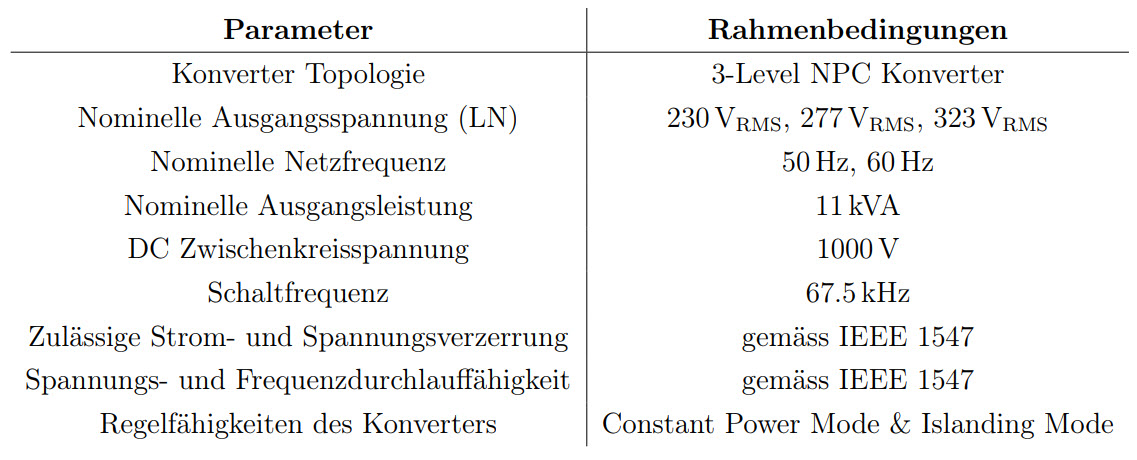 Die Anforderungen an einen AC-DC-Konverter für die Energieeinspeisung ins Versorgungsnetz soll detailliert untersucht werden. Was sind die Ziele und Normen, die erfüllt werden müssen? Weiter sollen Vor- und Nachteile von verschiedenen regelungstechnischen Möglichkeiten gegenübergestellt werden. Damit das theoretische Verhalten auch in der Realität überprüft werden kann, soll der Neutral-Point-Clamped (NPC) Konverter entwickelt und in Betrieb genommen werden.