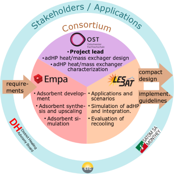 Sorptionswärmepumpen können auf der Basis von erneuerbarer Fernwärme oder Abwärme Kälte bereitstellen und somit den Anwendungsbereich der Fernwärmenetze (FWN) erweitern und bestehende erneuerbare Wärmequellen besser nutzen. Andererseits können Sorptionswärmepumpen in Fernwärme-Übergabestationen auch Wärme bereitstellen und gleichzeitig den Rücklauf des Fernwärmenetzes gegenüber einer Station mit gewöhnlichem Wärmetauscher deutlich senken und damit die Effizienz der Fernwärmeversorgung erhöhen. Kommerziell verfügbare Sorptionsmaschinen sind jedoch nicht auf FWN ausgelegt. Deshalb werden neue, ideal auf die Temperauren und Anwendungen in Fernwärmenetzen abgestimmt Sorptionsmaterialien entwickelt und in einen für Sorptionsmaschinen bestimmten Wärme- und Stoff-Überträger eingebaut.