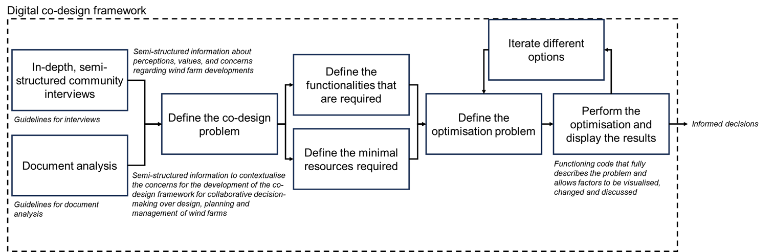 Infolgedessen ist der Widerstand gegen Windenergieprojekte auf lokaler Ebene gross, und sie lassen sich nur langsam oder gar nicht entwickeln. In diesem Projekt wird ein digitales Co-Design-Framewerk entwickelt, das die Zusammenarbeit und den Dialog über künftige Windenergieentwicklungen zwischen lokalen Gemeinden, Behörden, Interessengruppen und Windenergieexpert:innen erleichtern soll, wobei der Schwerpunkt auf den potenziellen ökologischen, sozialen und wirtschaftlichen Vorteilen liegt. Wir schlagen einen einzigartigen integrierten und interdisziplinären sozial- und ingenieurwissenschaftlichen digitalen Ansatz vor, der die mathematische Co-Design-Theorie mit Stakeholder-Engagement-Methoden kombiniert, um zum ersten Mal qualitative Aspekte aus Stakeholder-Engagement-Prozessen direkt in die Entwurfsphase einzubeziehen.