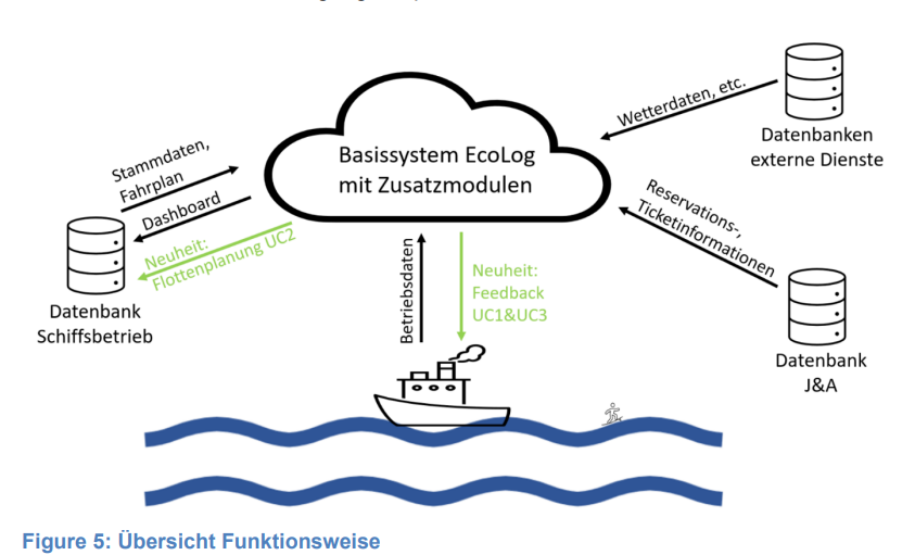 - Dynamische Flotteneinsatzplanung (UC2): Eine smarte Einsatzplanung basiert auf Prognosen zur Nachfrage und zu Umweltfaktoren wie Wetter oder Wasserstand. Mithilfe datenbasierter Modelle wird bestimmt, wann welches Schiff mit welchem Verbrauchsprofil optimal eingesetzt werden kann – das erhöht die Auslastung, reduziert Leerfahrten und senkt den Energieverbrauch.