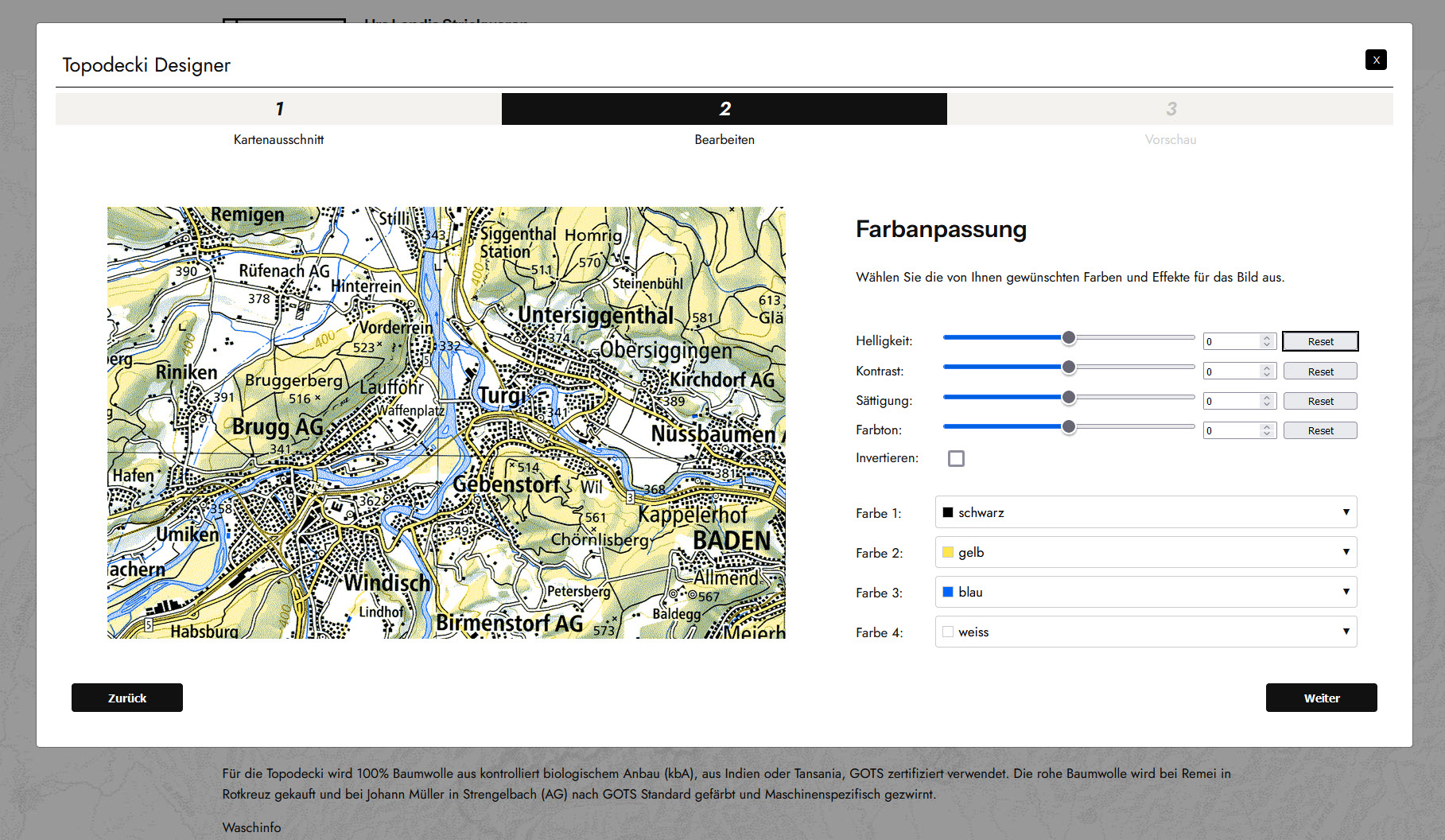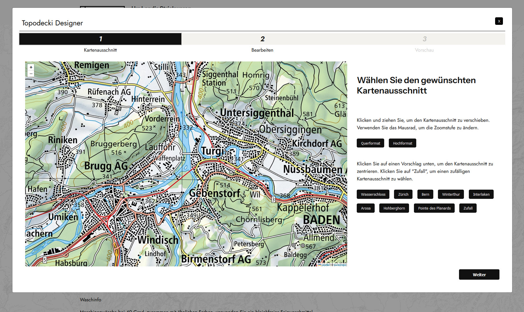 Kund:innen können über eine visuell geführte, wizard-basierte Oberfläche in Echtzeit eigene Designwünsche umsetzen – etwa durch die Auswahl individueller Motive, wie Kartenausschnitte, die mittels KI-gestützter Bildoptimierung aufbereitet und für den Strickprozess vorbereitet werden.