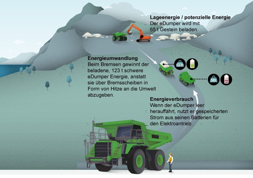 Der 113t Muldenkipper befördert bei jeder Fahrt 65t Gestein ins Tal. Mit Hilfe des rekuperierten Stroms der Talfahrt erreicht das leere Fahrzeug unter guten Bedingungen seinen Ausgangspunkt. Damit werden jährlich 50'000 Liter Diesel (1300 t CO2) eingespart.