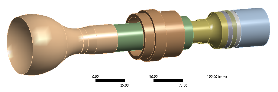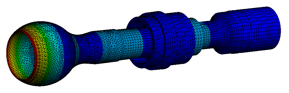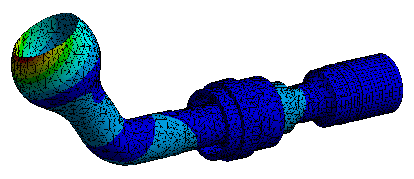 Mit dieser Schneide liess sich aber noch kein Eis in Kugelform portionieren. Daher musste eine neue, eher rundliche Form entwickelt werden, die im gewählten Frequenzbereich von etwa 35kHz auch richtig schwingt. Bei ganz bestimmten Frequenzen treten bei einer Sonotrode Resonanzen auf, auch Eigenmoden genannt, die durch die Überlagerung der hin- und herlaufenden Welle als Stehwelle zustande kommen. Dies ist vergleichbar mit dem Schwingen eines Resonanzkastens einer Geige oder einer Gitarre. Je nach Tonlage (d.h. Frequenz) ergeben sich auf dem Resonanzkasten an unterschiedlichen Stellen Wellenbäuche und Wellentäler. Die Kunst beim Auslegen einer Sonotrode liegt darin, diese so zu gestalten, dass die Wellenbäuche, d.h. die Orte maximaler Amplitude gerade an der Klinge entstehen. Diese Schwingungsmoden wurden mit dem FEM-Programm ANSYS Workbench berechnet und optimiert [8-10]. Es wurden verschiedene Schneidenformen konzipiert und deren Schwingungsmoden analysiert. Viele der angedachten Schneidenformen mussten ausgeschlossen werden, da deren günstige Resonanzfrequenzen ausserhalb des ansteuerbaren Bereichs des Verstärkers lagen.