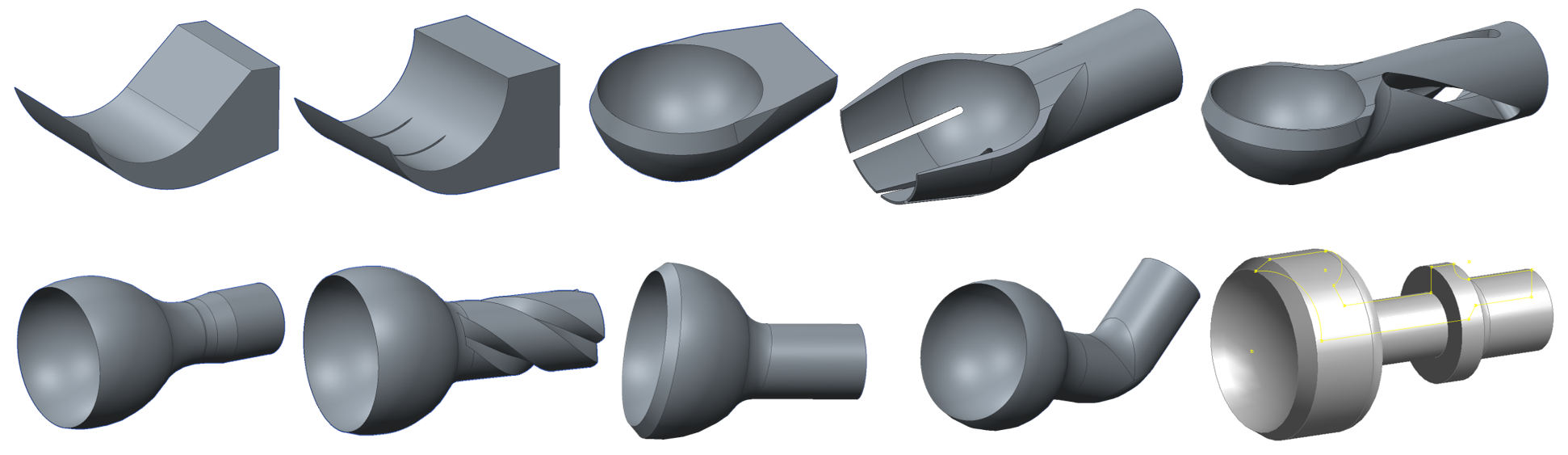 Aus den Simulationen gingen zwei rotationssymmetrische, glockenförmige Klingen hervor (A und B), wobei die eine mit einem Winkelversatz im Schaft versehen ist, um eine bessere Handhabung im Portionier-Prozess zu erreichen. Die zwei rotationssymmetrischen Portionierer konnten in hochfestem Titan gefertigt und erfolgreich getestet werden. Sie wurden ebenfalls mit einem Inplane-Vibrometer vermessen. Es zeigte sich hier, dass die realen Amplituden deutlich kleiner ausfielen als in der Simulation. Die Messergebnisse bestätigten jedoch, dass die Sonotroden in der gesuchten Eigenfrequenz schwingen. Ebenfalls konnte eine deutliche Schnittkraftreduktion im Medium Rahmeis erreicht werden. Die Ergebnisse bestätigen die Wirksamkeit eines ultraschallbetriebenen Eisportionierers.