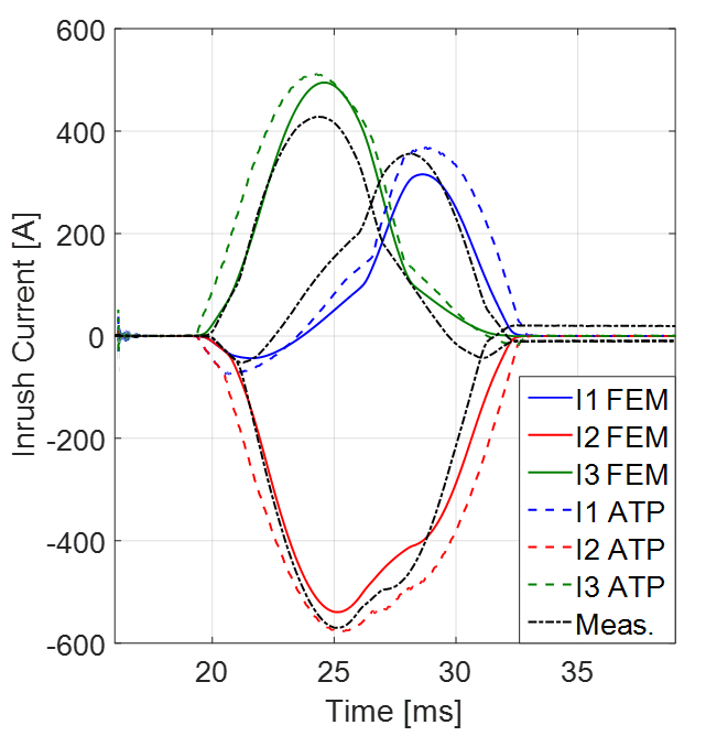 Das Phänomen der Einschaltströme bei Leistungstransformatoren ist weit bekannt und kann schon seit Jahrzehnten mit guter Genauigkeit berechnet werden. Ein Transformator der eingeschaltet wird, erzeugt jedoch nicht nur in sich selbst hohe Einschaltströme, sondern kann parallel geschaltete Transformatoren ebenfalls in Sättigung führen. In dem Transformator, welcher sich vorher bereits in Betrieb befand, werden somit auch Einschaltstromspitzen erzeugt. Das gekoppelte System erfährt dadurch den Effekt der sogenannten mitschwingenden Einschaltströme (engl. Sympathetic Inrush Current). Die Theorie legt nahe, dass die mitschwingenden Einschaltströme die Hauptursache für das ursprüngliche Spannungsproblem sind. Dieses Phänomen ist vor allem in kompensierten Mittelspannungsnetzen weit weniger genau dokumentiert als der einfache Einschaltstrom. Darum musste ein detailliertes Simulationsmodell des Unterwerks in EMTP (Electromagnetic Transients Program) erstellt werden um die nichtlinearen Effekte bei den Schaltvorgängen aufzuzeigen. Die Schwierigkeit dabei war hauptsächlich die korrekte Modellierung der Transformatoren. Zur Bestimmung der Trafoparameter wurden unteranderem auch magnetische Feldsimulationen mit einer FEM-Software durchgeführt.