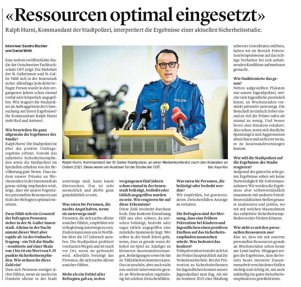 Sicherheit und Vertrauen in der Bevölkerung werden durch präventive, bürgernahe und vernetze Polizeiarbeit erreicht. Die Leistung wird an der Zufriedenheit der Bevölkerung gemessen. Das Sicherheitsempfinden spielt dabei eine zentrale Rolle. Das Projekt hat das Ziel, das Sicherheitsempfinden in der St.Galler Innenstadt zu quantifizieren. Es soll ermittelt werden, wer sich in der Innenstadt unsicher fühlt, in welchem Grad das Sicherheitsgefühl ausgeprägt ist und was Treiber/Gründe dafür sind. Dies soll an zwei definierten Zeitpunkten (Mai und November 2022) erhoben, ausgewertet und eine entsprechende Verlaufsentwicklung dargestellt werden.