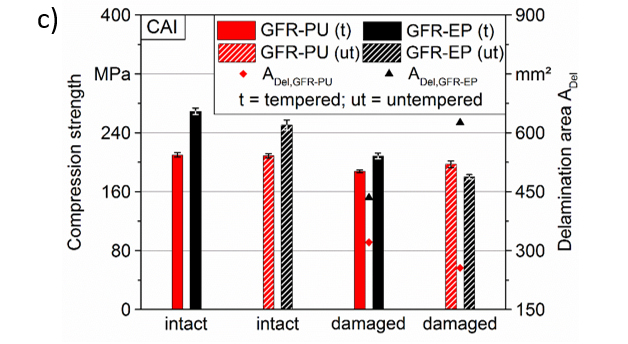 Nach dem Aufbau der Produktionseinheiten (Abb.2, monolithisch und Sandwich) wurden die Prozessrouten und Harzsysteme festgelegt und weiterentwickelt. Materialcharakterisierungen an Platten aus glasfaserverstärktem Polyurethan (GFK-PU) zeigten höhere Festigkeitswerte (Zug) und bessere Impacteigenschaften als vergleichbare Epoxidplatten (Abb. 3). Der entwickelte HD-RTM-Prozess überzeugt hinsichtlich Wirtschaftlichkeit und Prozessintegration. Das Projekt konnte mit der Produktion eines im PUR-RTM-Verfahren hergestellten Nosecone und einer Sandwich-Sitzschale erfolgreich abgeschlossen werden.