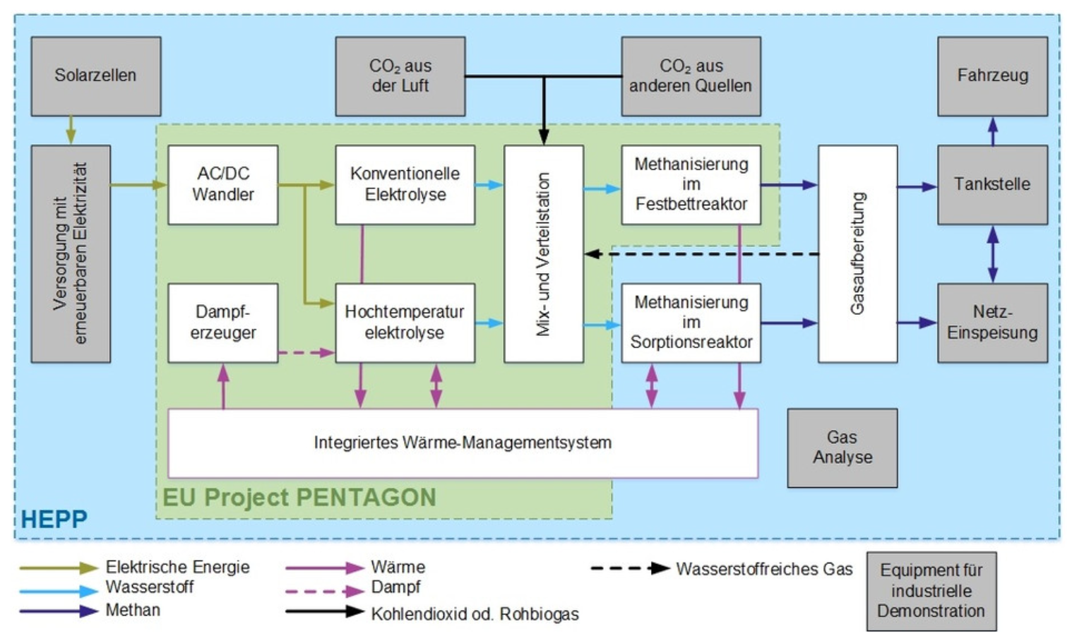 Das Projekt HEPP (High Efficiency Power-to-Gas Pilot) wird von 2017 bis 2020 durchgeführt und von einer Trägerschaft aus Forschungsförderung und Industrie realisiert. Die Forschungsergebnisse fliessen in das Forschungsrahmenprogramm Horizon 2020 der Europäischen Union in das Projekt Pentagon ein, an dem insgesamt zehn Institutionen aus der akademischen Forschung und der Industrie aus fünf europäischen Ländern beteiligt sind.