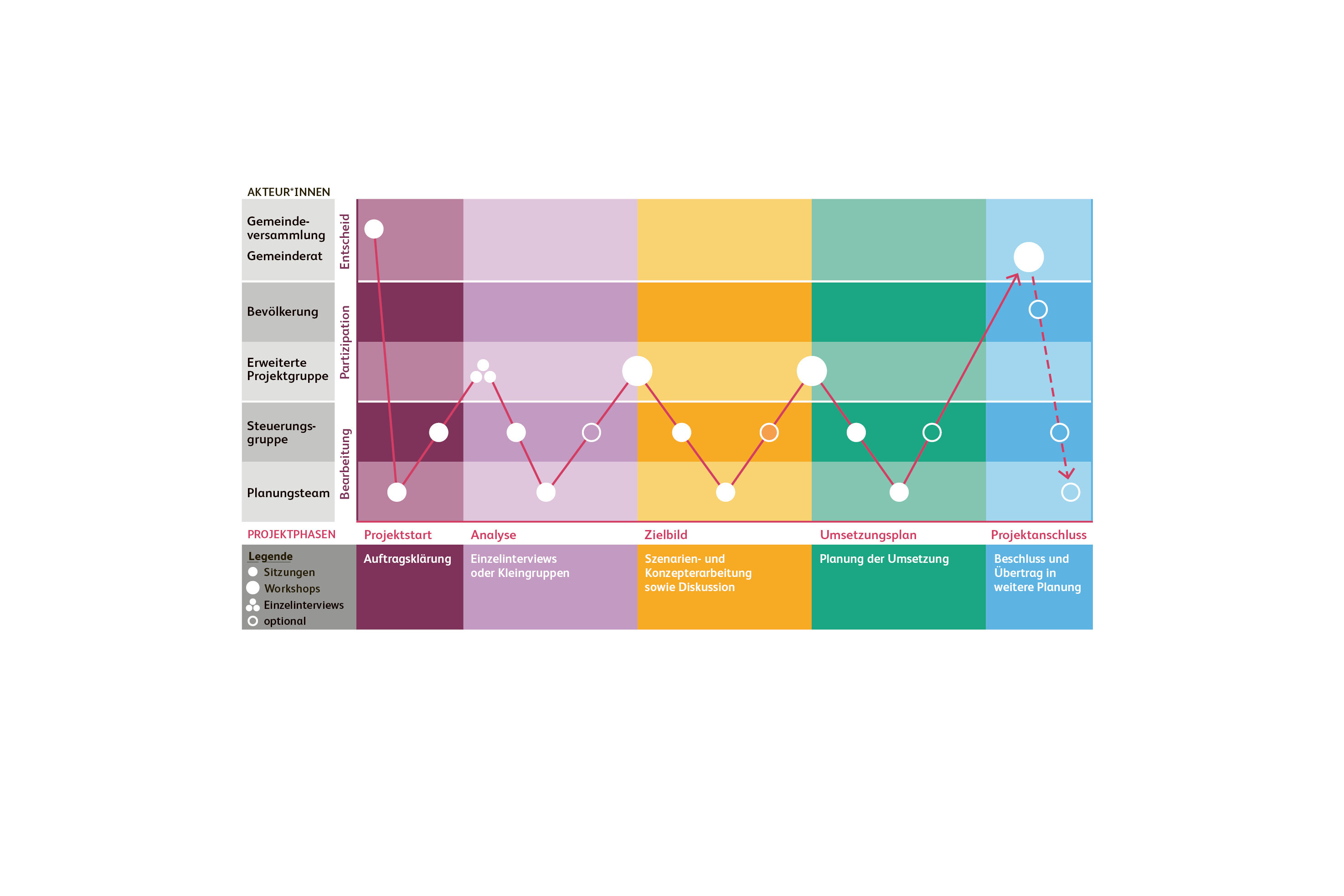 Hier setzt der neue Leitfaden an, der von der Ostschweizer Fachhochschule und der Hochschule Luzern entwickelt worden ist. Die Autorinnen und Autoren haben eine Vielzahl verschiedenster Fallbeispiele aus der Praxis analysiert und dabei gewisse Muster und Kernelemente erkannt, die bei den konkreten Fällen fürs Gelingen oder Misslingen entscheidend waren. Die daraus entwickelten Musterprozesse für unterschiedliche Komplexitätsstufen bilden das Kernstück des nun vorliegenden Leitfadens für die Praxis.