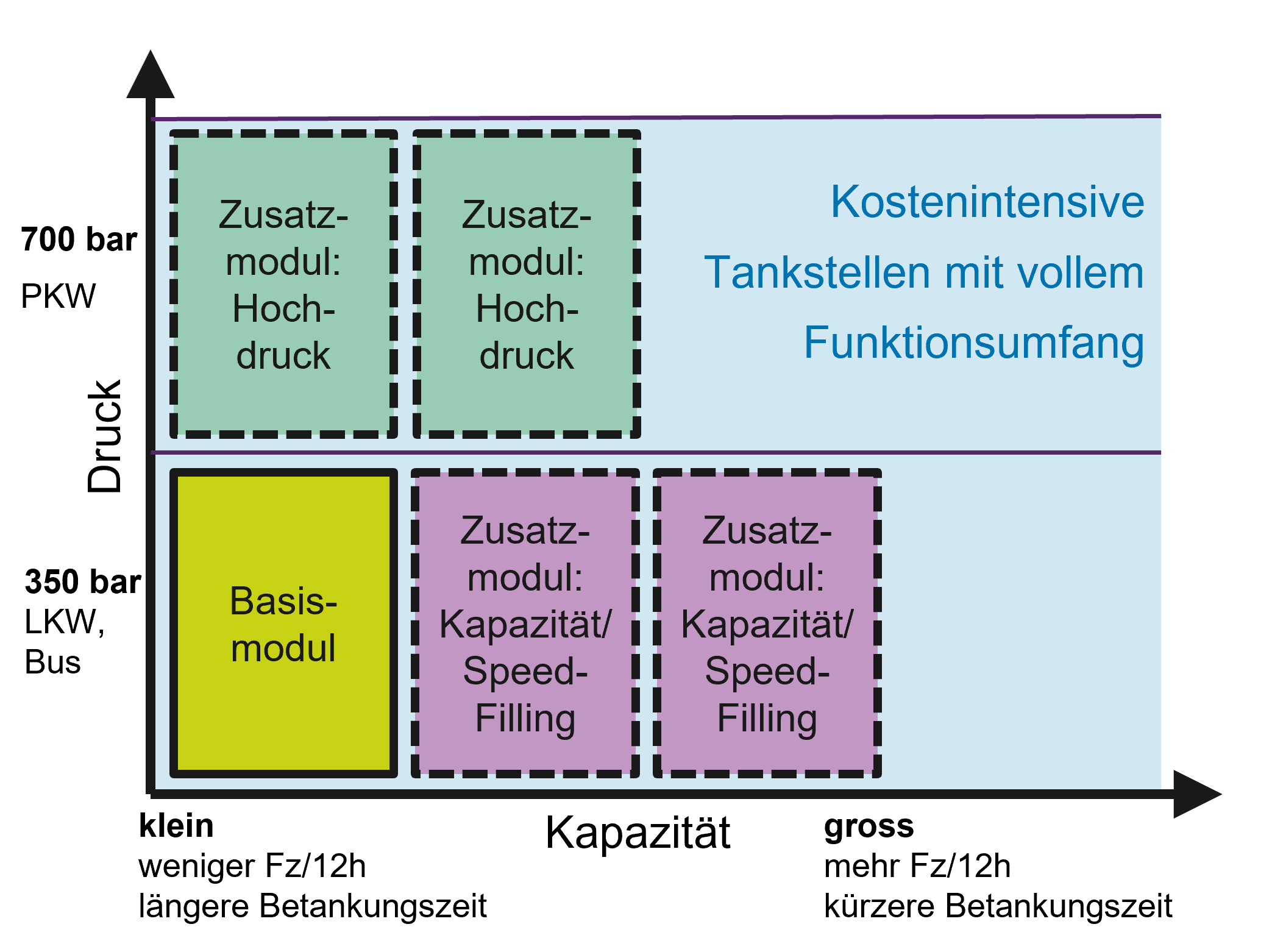 Das Serienprodukt soll schlussendlich modular aufgebaut sein und sich an die Bedürfnisse des Kunden anpassen lassen. Der Einstieg in die Wasserstoff-Welt würde mit dem H35-Basismodul zur Betankung von LKWs und Bussen mit 350-bar-Drucksystemen ermöglicht werden. Will ein Nutzer eines H35- Basismoduls die Betankungsleistung erhöhen, könnte er dies durch Zukauf eines H35-Zusatzmoduls (Zusatzmodul: Kapazität) erreichen. Sollen auch PKWs mit 700-bar-Drucksystemen vollständig betankt werden, wäre dies mit einem zugekauften H70-Zusatzmodul möglich.