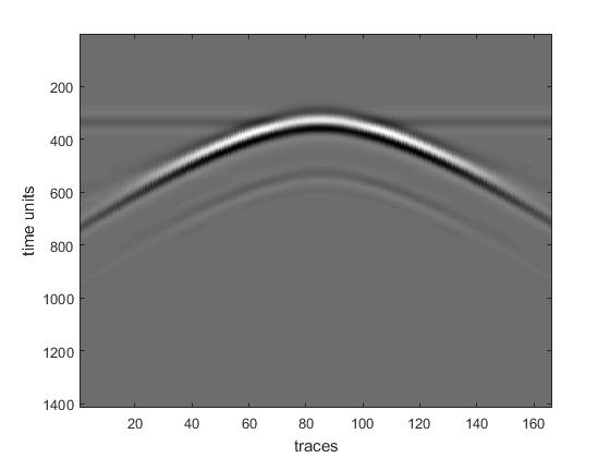 Abbildung 1 zeigt einen solchen B-Scan. Durch das Bewegen der Sende-/Empfangsantenne entlang der Oberfläche wird der Abstand zum Target verkürzt. Nachdem die Position direkt über dem Objekt, bei der die kürzeste Laufzeit und die stärkste Amplitude gemessen werden, passiert wurde, wird der Abstand zum Target erneut grösser. Es entstehen, wie in der Abbildung 1 zu sehen ist, eine charakteristische Reflektions-Hyperbel. Ziel ist es, diese Hyperbel mit mathematischen Methoden zu einem konzentrierten Objekt zu fokussieren, um dadurch eine realitätsnahe Abbildung des Untergrunds zu erhalten. Da die Antenne einen grossen Öffnungswinkel aufweist und somit Reflektionen aus unterschiedlichen Richtungen empfangen kann, werden Objekte auch dann detektiert, wenn diese nicht direkt unter der Antenne liegen. Dies ist Voraussetzung dafür, dass die Methode der synthetischen Apertur überhaupt angewendet werden kann, um die Objekte im Untergrund zu fokussieren. Der Scan über die Oberfläche sammelt verschiedene Beugungsordnungen aus unterschiedlichen Richtungen, ähnlich wie eine optische Linse mit einer grossen Apertur. Die Operation der synthetischen Fokussierung der empfangenen Wellenfelder nennt man Migration.