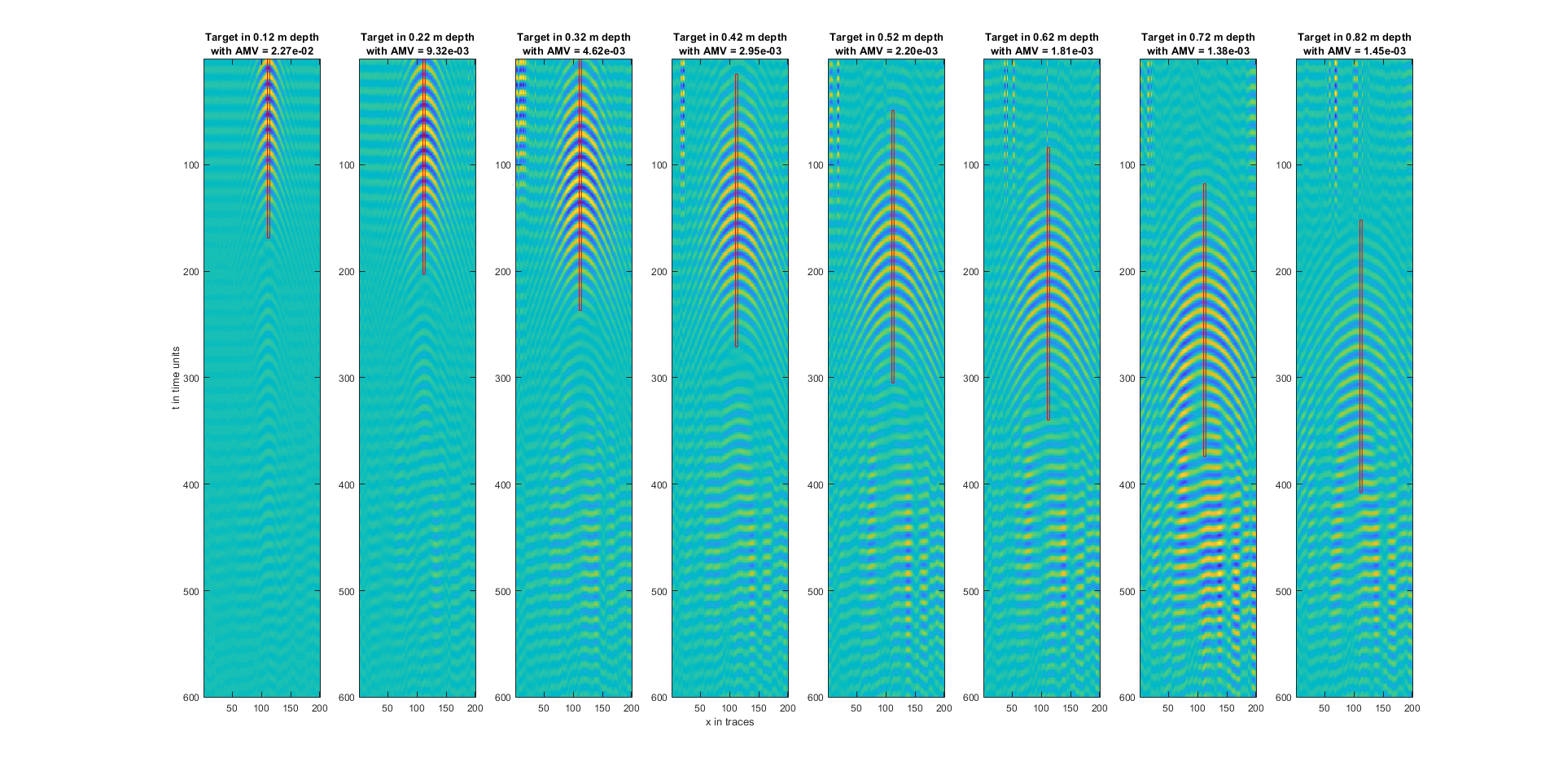 Abbildung 3 zeigt verschiedene B-scans über einem einzelnen Objekt (Target) in unterschiedlichen Tiefen. Klar erkennbar sind die Reflektions-Hyperbeln, welche mit zunehmender Objekt-Tiefe immer breiter werden. Dass im B-Scan nicht nur eine einzige Hyperbel erkennbar ist, lässt sich durch die limitierte Bandbreite des Systems erklären.