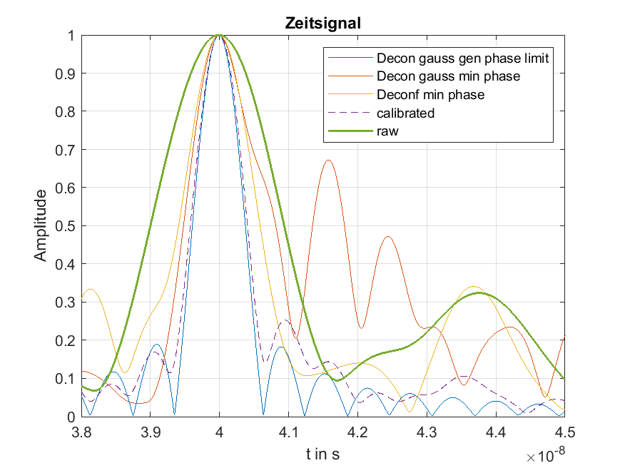 Man kann mittels mathematischer Methoden versuchen, die Bandbreite des Signals optimal zu nutzen, um einen möglichst scharfen, kurzzeitigen Puls und damit auch eine möglichst gute Auflösung in der Tiefe zu bekommen. Diese Operation nennt man Entfaltung. Im Frequenzbereich wird das Spektrum so verändert, dass daraus nach anschliessender Rücktransformation in den Zeitbereich ein möglichst kurzer, schöner Puls mit möglichst wenig Nachschwingern entsteht. Abbildung 4 zeigt beispielhaft, wie die Pulsbreite durch optimale Ausnutzung des relevanten Frequenzspektrums deutlich reduziert werden kann. Die Entfaltung ist eine inverse Operation, und damit immer heikel anzuwenden. Die Bandbreite lässt sich nicht künstlich vergrössern, man kann nur unterschiedlich gewichten.