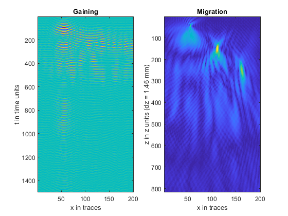 Die wichtigste Operation nach der Entfaltung und dem Gaining, welches versucht, die untergrundspezifischen Verluste zu kompensieren, ist die Migration. Damit werden die Daten eines B-Scans fokussiert, vergleichbar mit der Wirkungsweise einer Sammellinse, welche unterschiedliche Beugungsordnungen aus unterschiedlichen Richtungen zusammenführt und an einem Fokuspunkt zur Interferenz bringt. Verschiedene Migrationsalgorithmen haben sich etabliert und wurden in dieser Arbeit auch getestet. Aufgrund der Echtzeit-Anforderung an den Handscanner, haben wir uns für die schnellste dieser Methoden entschieden, die fk-Migration (Stolt-Migration) [5].