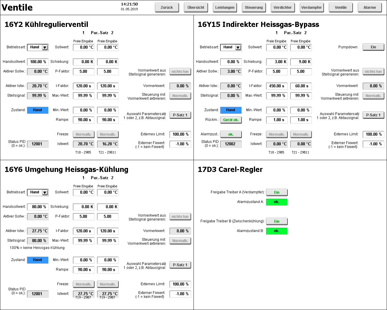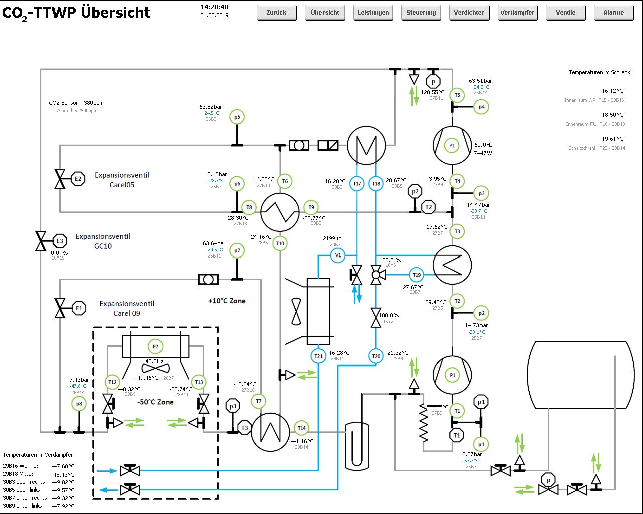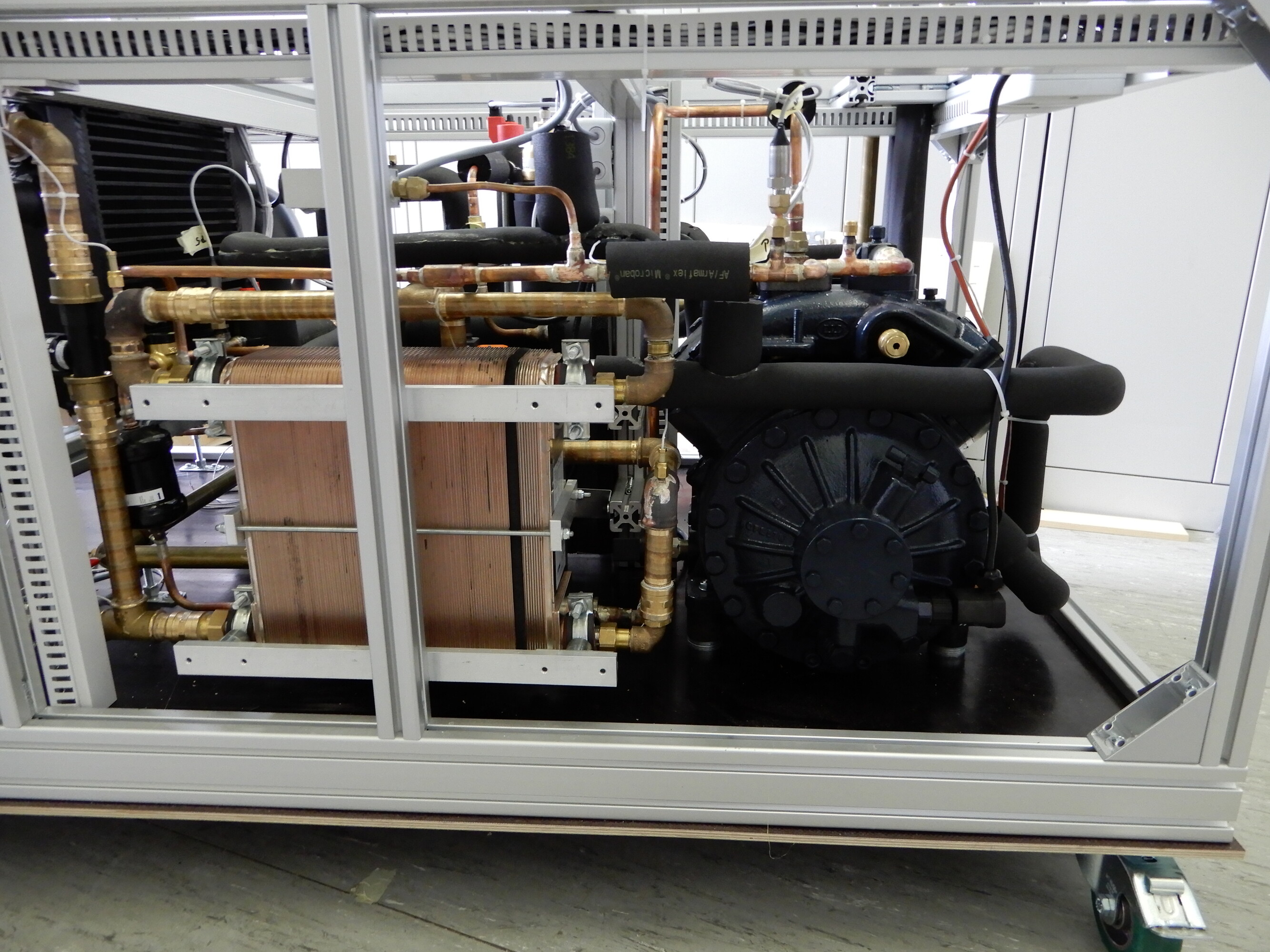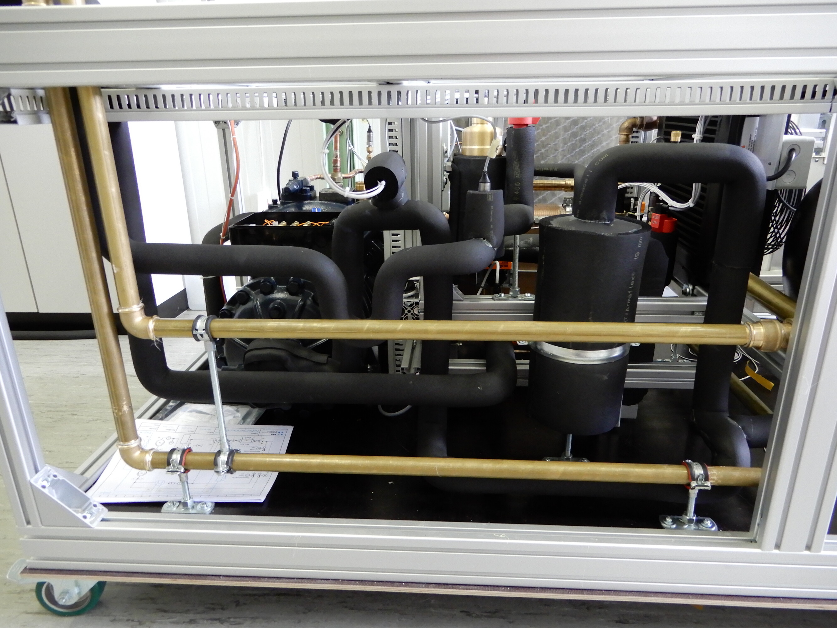 Die Anlage ist als zweistufiger Kreislauf mit Zwischenkühlung aufgebaut, und zusätzlich instrumentiert, um auch Semesterarbeiten durchführen zu können. Dabei können verschiedene Regelungskonzepte wie Drehzahlregelung, indirekte Heissgasbypassregelung und Wärmepumpenkreisläufe im Praktikum untersucht werden. Zudem gibt die Anlage mit dem Kältemittel R744 (CO2) den Studenten einen Einblick in die Welt der natürlichen anorganischen Kältemittel. Deren Bedeutung in der Praxis aufgrund der immer strenger werdenden F-Gas Verordnung in Bezug auf Ozon- und Treibhauseffekt steigt.