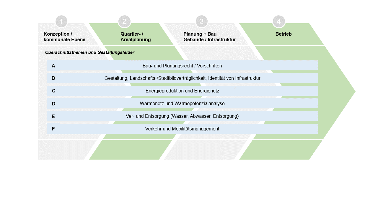 Durch den Bearbeitungsprozess, bei dem verschiedene Handbücher und Checklisten zu diesen Themen wie der Energieversorgung oder der Mobilität ausgewertet wurden, konnten die untersuchten Themen ausgewertet, sortiert und verlinkt werden. Zur Anwenderfreundlichkeit des Prozesses trägt auch die Gliederung nach Themen einerseits, andererseits aber auch die Phase der Realisierung bei. Inzwischen hat der Kanton das Ergebnis als Wissensdatenbank auf der Kantonswebsite aufgeschaltet. Es beabsichtigt, diesen Überblick zweimal pro Jahr zu aktualisieren.