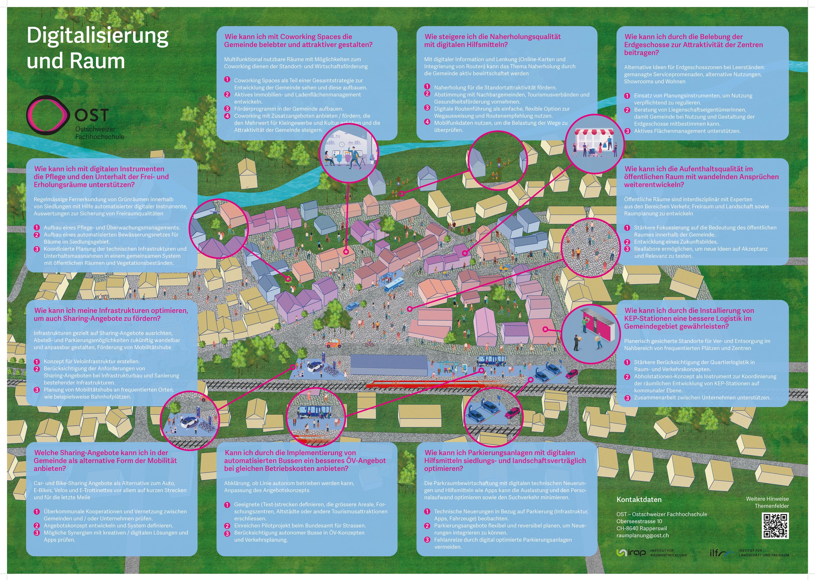 Das Thema «Digitalisierung» ist ein diskutierter Megatrend. Für Technik und Fachplanungen kristallisieren sich die Entwicklungsstands allmählich heraus. Doch wie sich die Digitalisierung auf den Raum und die Planung auswirkt ist momentan noch kaum erforscht. Empfehlungen für Gemeinden und Regionen fehlen gänzlich: Können durch zunehmende Automatisierung im Verkehr die Strassenräume siedlungsverträglicher gestaltet und das Verkehrsaufkommen verträglicher abgewickelt werden? Wie sieht eine zukunftsfähige Versorgung aus und welche Funktionen werden Orts- und Stadtzentren in Konkurrenz zum zunehmenden Online-Handel übernehmen? Führt eine Industrie 4.0 zu einer Nutzungsmischung von Arbeiten und Wohnen? Und wie sieht die 'digitale Freizeitnutzung' aus, welche Infrastrukturen werden dazu benötigt und wie können Sport-, Freizeit- und Naherholungsbedürfnisse ökologisch verträglicher abgewickelt werden?