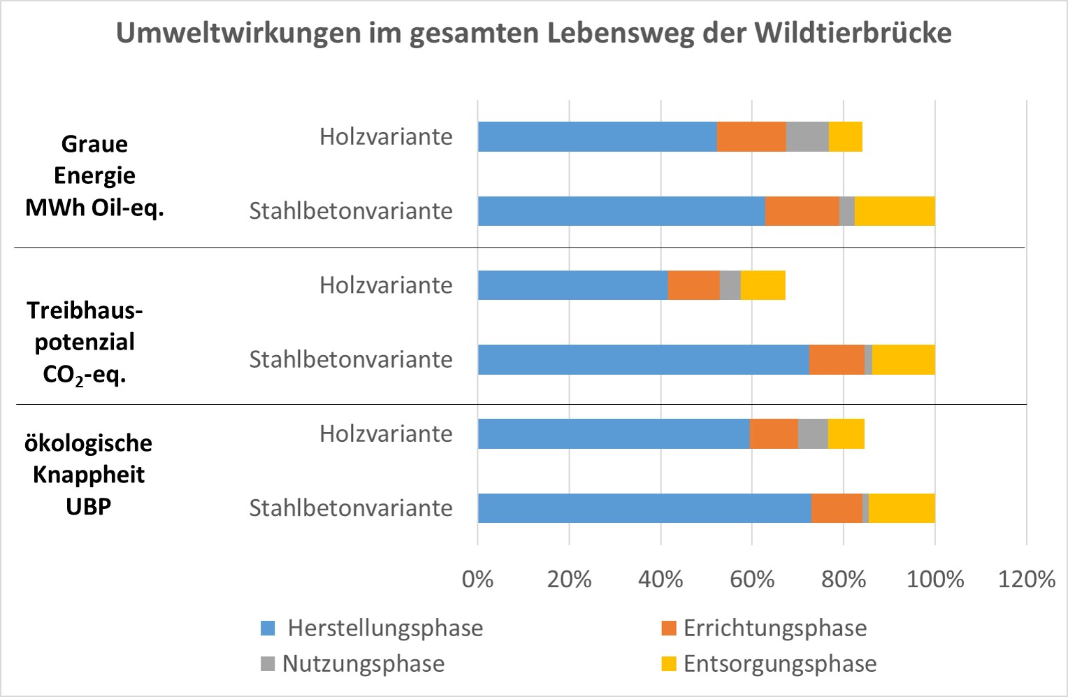 Vergleichen wurden ein Rahmentragwerk aus Stahlbeton, ein Bogentragwerk aus Stahlbeton und ein Bogentragwerk aus Holz. Die Daten wurden auf der Stufe des Vorprojektes erfasst. Die Ergebnisse zeigen einen klaren Vorteil der Holzvariante in Bezug auf das Treibhauspotenzial. Für andere Umweltwirkungen sind die beiden Varianten mit Bogentragwerk vergleichbar. Das Rahmentragwerk schneidet in Bezug auf alle Umweltwirkungen schlechter ab.