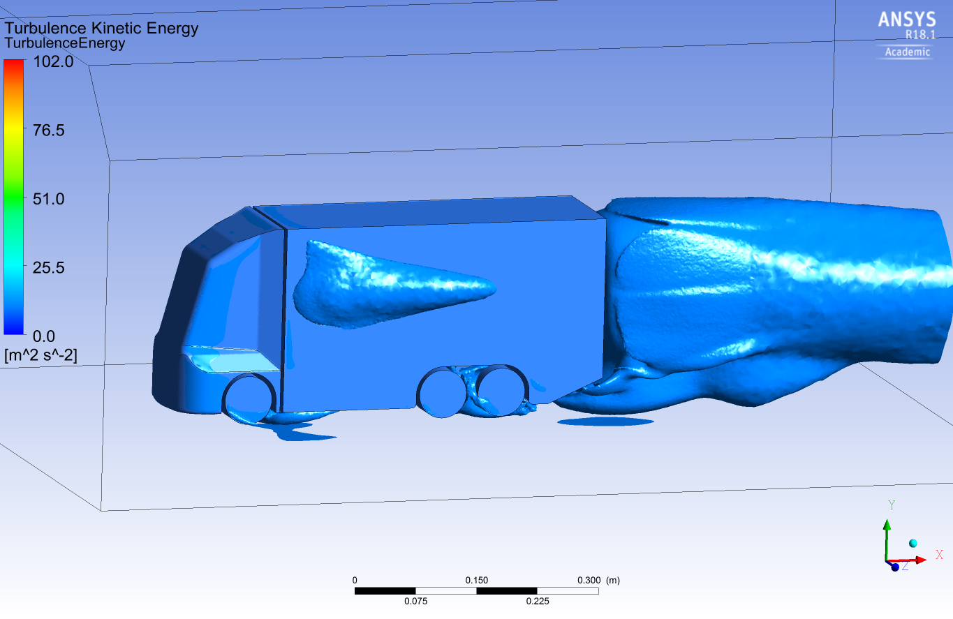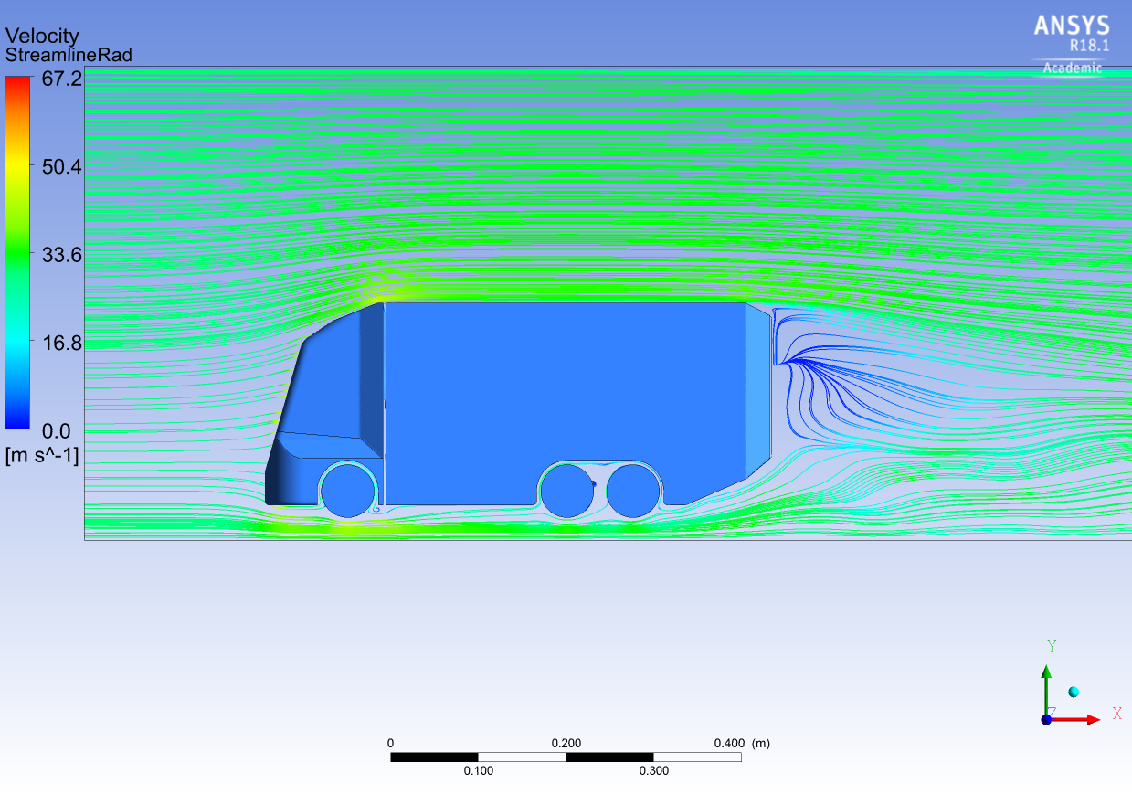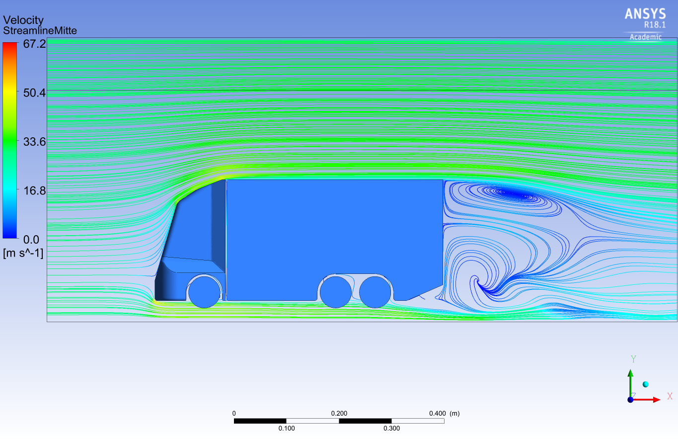Die verschiedenen Konfigurationen, beginnend mit dem herkömmlichen LKW-Modell, wurden der Reihe nach unter denselben Bedingungen simuliert. Dabei wurden die Widerstandsbeiwerte der unterschiedlichen Heckformen anhand der Widerstandskräfte berechnet und die Stromlinien und Druckverteilungen mittels anschaulichen Grafiken dargestellt. Dies erlaubt einen Vergleich der Konzeptvarianten untereinander und mit dem ursprünglichen LKW-Modell.