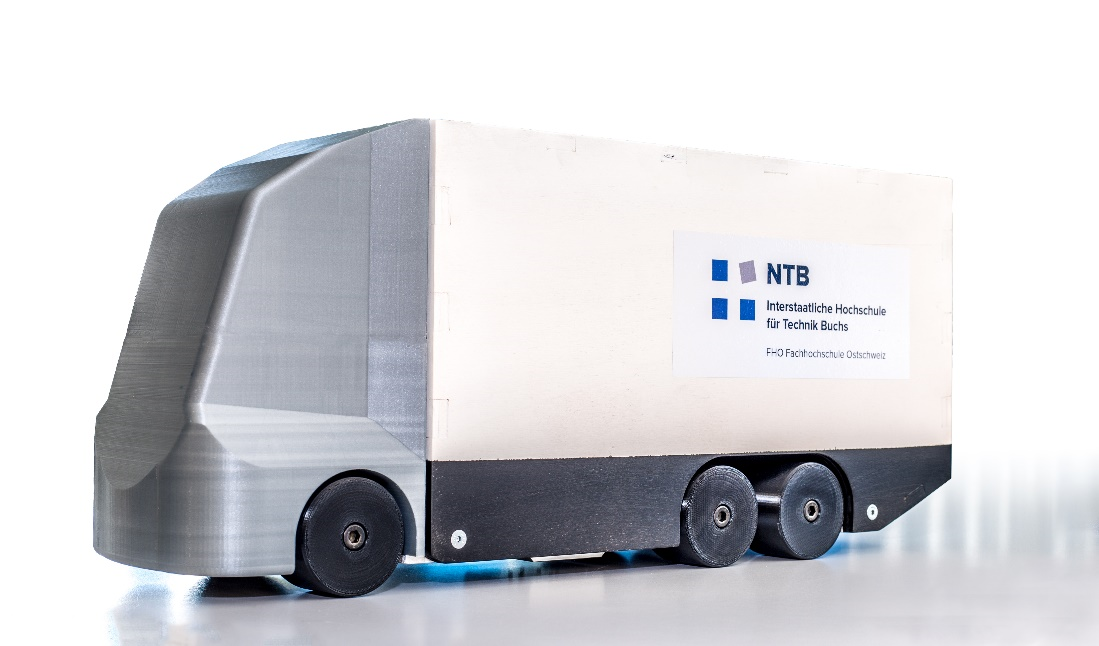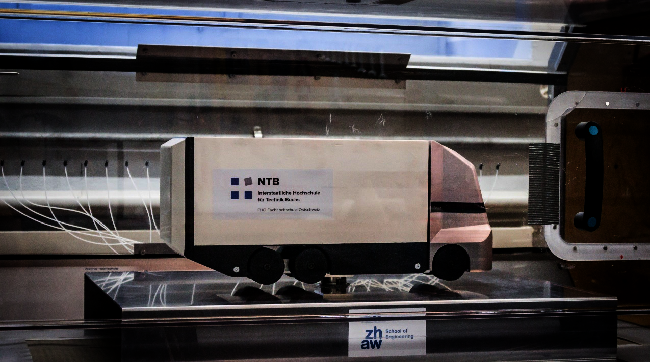 Für die Simulationen und die Windkanalversuche wurde ein LKW-Modell entwickelt. Das Modell entspricht 6 % eines originalen Lastwagens und ist speziell auf die Dimension des Windkanals ausgerichtet. Die CAD-Daten wurden im Simulationstool übernommen oder in leicht vereinfachter Form nachgebildet. Für die Windkanalmessungen wurde das Modell aus gefrästen, lasergeschnittenen und 3D-gedruckten Kunststoff-, Holz- und Aluminiumteilen gefertigt. Die verschiedenen Anbauteile werden ebenfalls im CAD-Programm konstruiert, in das Simulationsprogramm übertragen und für die Testmessungen im 3D-Drucker hergestellt.