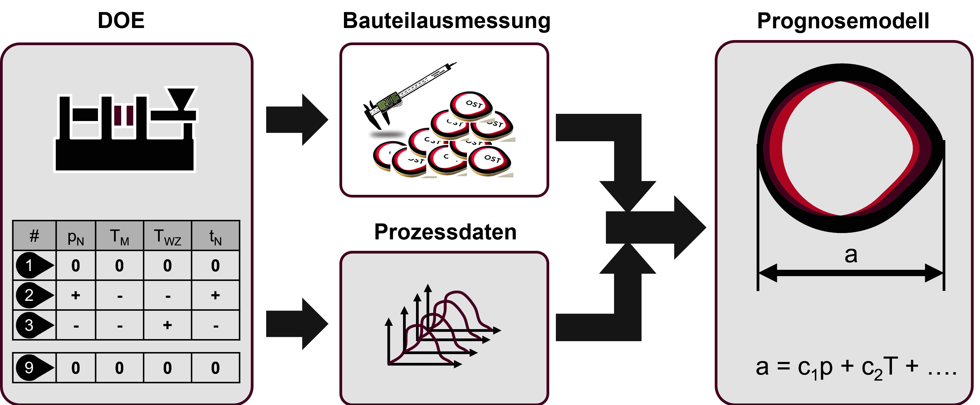 Zur Reduktion des Messaufwandes für die Überwachung und Sicherstellung der Bauteilabmasse in der Spritzgiessfertigung kommen vereinzelt Prognosemodelle zum Einsatz. Diese verwenden üblicherweise die für die Verarbeitungsschwindung relevanten Sensorsignale, wie Werkzeug-Innendruck und Werkzeug-Wandtemperatur, und korrelieren diese Werte über zahlreiche Versuche mit den Bauteilabmassen (Abb. 1). Als Ergebnis liegt dann jeweils ein theoretisch begrenzt gültiges rein phänomenologisches Überwachungsmodell vor. Zudem ist ein hoher Experimentalaufwand mit zahlreichen Versuchen und Ausmessungen erforderlich.