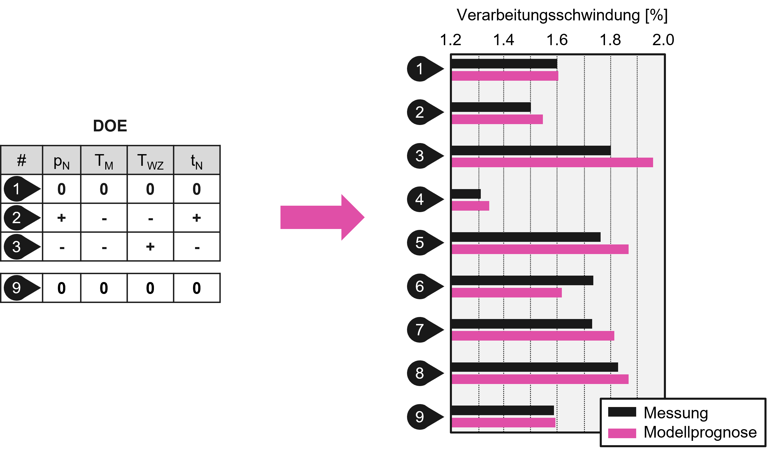 Erste Ergebnisse (Abb. 3) am Beispiel des OST-Gadgets und dem Werkstoff PP zeigen, dass das Modell in der Lage ist, die Auswirkungen der über einen DOE eingebrachten Prozess-Variationen auf die Verarbeitungsschwindung (bezogen auf das Längenmass des Gadget) mit max. absoluten Abweichungen von 0.15% vorherzusagen.