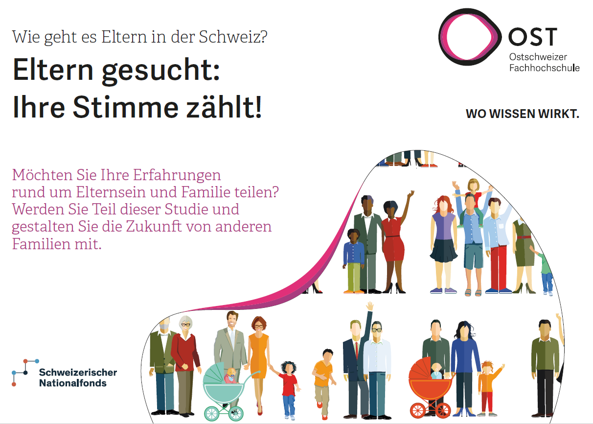 Das Projektteam ist an unterschiedlichen Familienformen interessiert (Regenbogen, Patchwork, Hetero usw.) und sucht Eltern von 0- bis 12-jährigen Kindern, welche mit ihren Kindern zusammenwohnen und ihre persönlichen Erfahrungen in einem Interview teilen möchten. Das Interview dauert ca. 1-1,5h und findet mit beiden erwachsenen Personen gemeinsam statt.