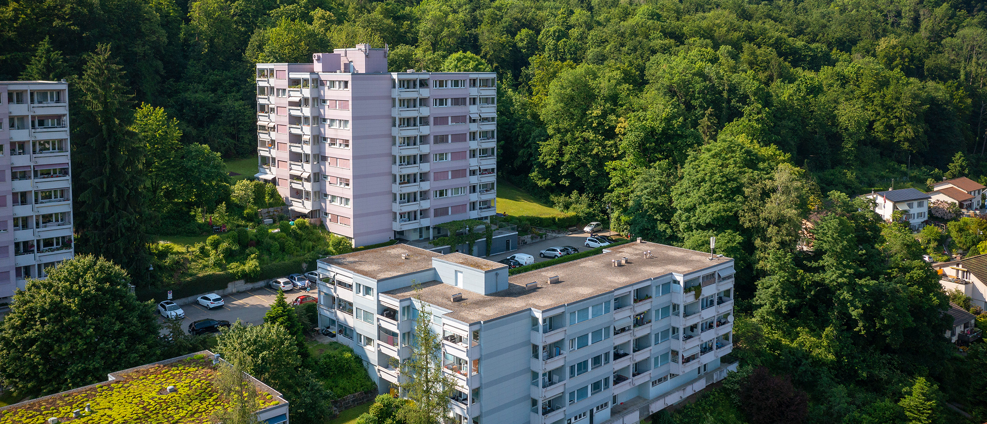 Die Wohngenossenschaft Lägern Wohnen besitzt in Baden zwei Mehrfamilienhäuser mit je 28 Wohnungen auf insgesamt 4'190 m2 Wohnfläche. Die Mehrfamilienhäuser in Abbildung 2 mit Baujahr 1972 befinden mehrheitlich im Originalzustand und wurden zuletzt in den 90er Jahren leicht saniert. Die gemeinsame Wärmeerzeugung mittels Ölkesseln von gesamthaft 200 kW ist in der Heizzentrale im Kellergeschoss des einen Mehrfamilienhauses installiert. Das andere Mehrfamilienhaus ist mittels einer Fernleitung an die Heizzentrale angeschlossen. Der analysierte Heizölverbrauch über die letzten 14 Jahren ergibt einen durchschnittlichen Jahresverbrauch von 60'000 l Heizöl resp. 600 MWh/a.