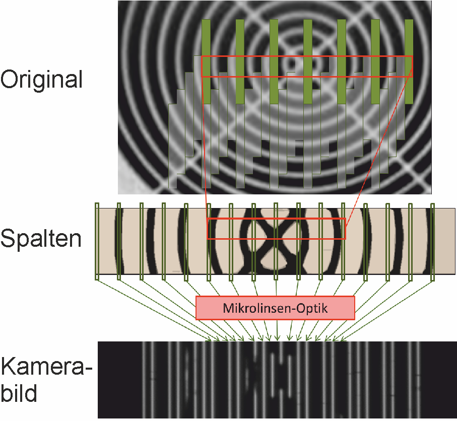 Damit mit einer Flächenkamera kontinuierlich gescannt werden kann, wird das Bild mit einer speziellen Optik so erzeugt, dass zwischen den abgebildeten Spalten Zwischenräume entstehen. Damit kann die Kamera kontinuierlich schräg über das Objekt gefahren werden und es werden trotzdem gleichzeitig alle Pixel der Kamera belichtet.