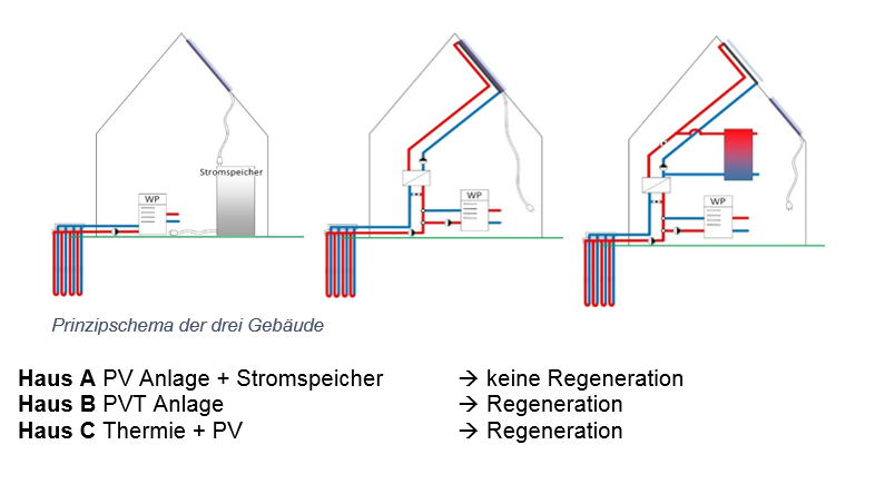 In diesem P&D-Projekt werden drei baugleiche Minergie-A Mehrfamilienhäuser mit drei unterschiedlichen, solarunterstützten Wärmeerzeugungssystemen versehen: PV, PVT und solarthermische Flachkollektoren. Die Heizungssysteme bestehen aus erdsondengekoppelten Wärmepumpen, die mittels einer neu entwickelten, prädiktiven und adaptiven Regelung angesteuert werden. Bei den Systemen mit solarthermischer Anlage wird das Erdsondenfeld regeneriert. Das dritte Gebäude mit PV und Erdsondenfeld ohne Regeneration dient als Referenzanlage. Temperatursensoren in der Tiefe von 50 m, 110 m und 170 m erlauben die Messung von Temperaturänderungen in je einem Bohrloch pro Sondenfeld. Das Ziel ist es, mit den erfassten Daten das gesamte Wärmeerzeugungssystem bei allen drei Gebäuden abzubilden, Optimierungen aufzuzeigen und mit dem direkten Vergleich das Potential von verschiedenen Solarsystemen bei der Regeneration von Erdsondenfeldern zu untersuchen.